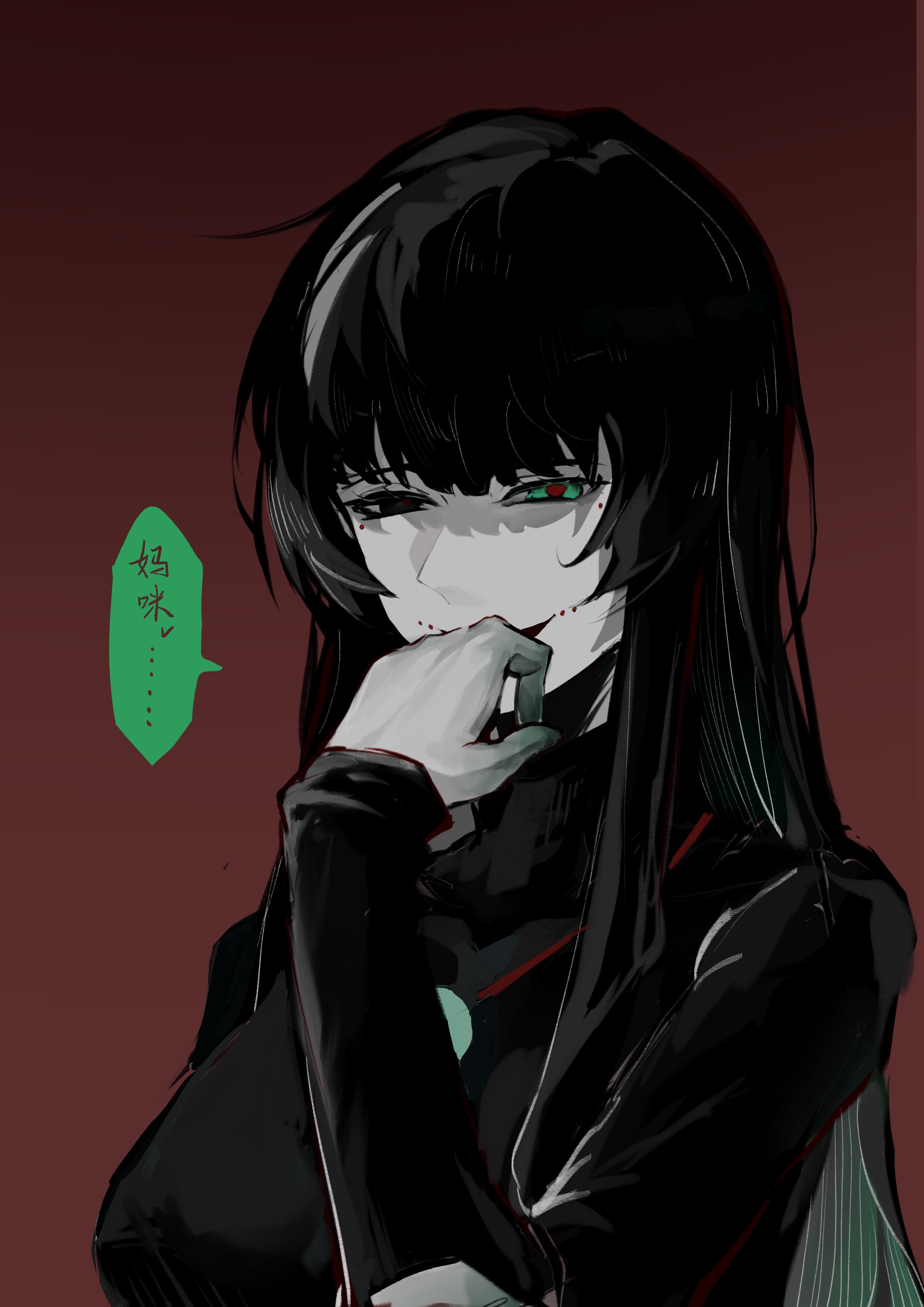 1girl absurdres black_eyes black_hair black_shirt breasts chinese_commentary chinese_text colored_extremities colored_skin commentary_request green_eyes heterochromia highres jewelry large_breasts long_hair naihe_(female)_(touqi_guaitan) necklace open_mouth red_background red_pupils shirt shuanghei69675 smile solo speech_bubble touqi_guaitan translation_request upper_body white_skin