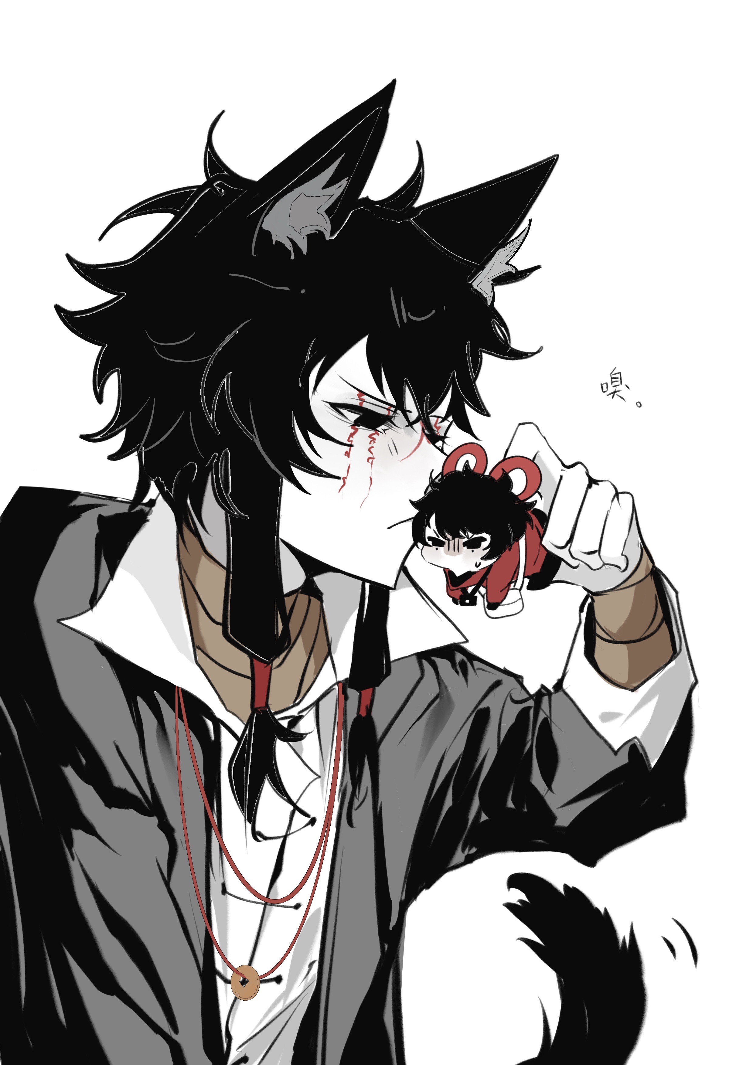 2boys absurdres animal_ear_fluff animal_ears black_eyes black_hair black_jacket black_pants cat_boy cat_ears cat_tail chibi chinese_text closed_mouth collared_shirt commentary facepaint highres jacket kemonomimi_mode li_yuting_(male) male_focus mini_person miniboy mole mole_under_each_eye mole_under_eye mouse_boy mouse_ears multiple_boys multiple_moles open_clothes open_jacket pants red_shirt shirt short_hair short_hair_with_long_locks shuanghei69675 simple_background smelling sweat tail touqi_guaitan translation_request upper_body white_background white_shirt ziche_fuzhao