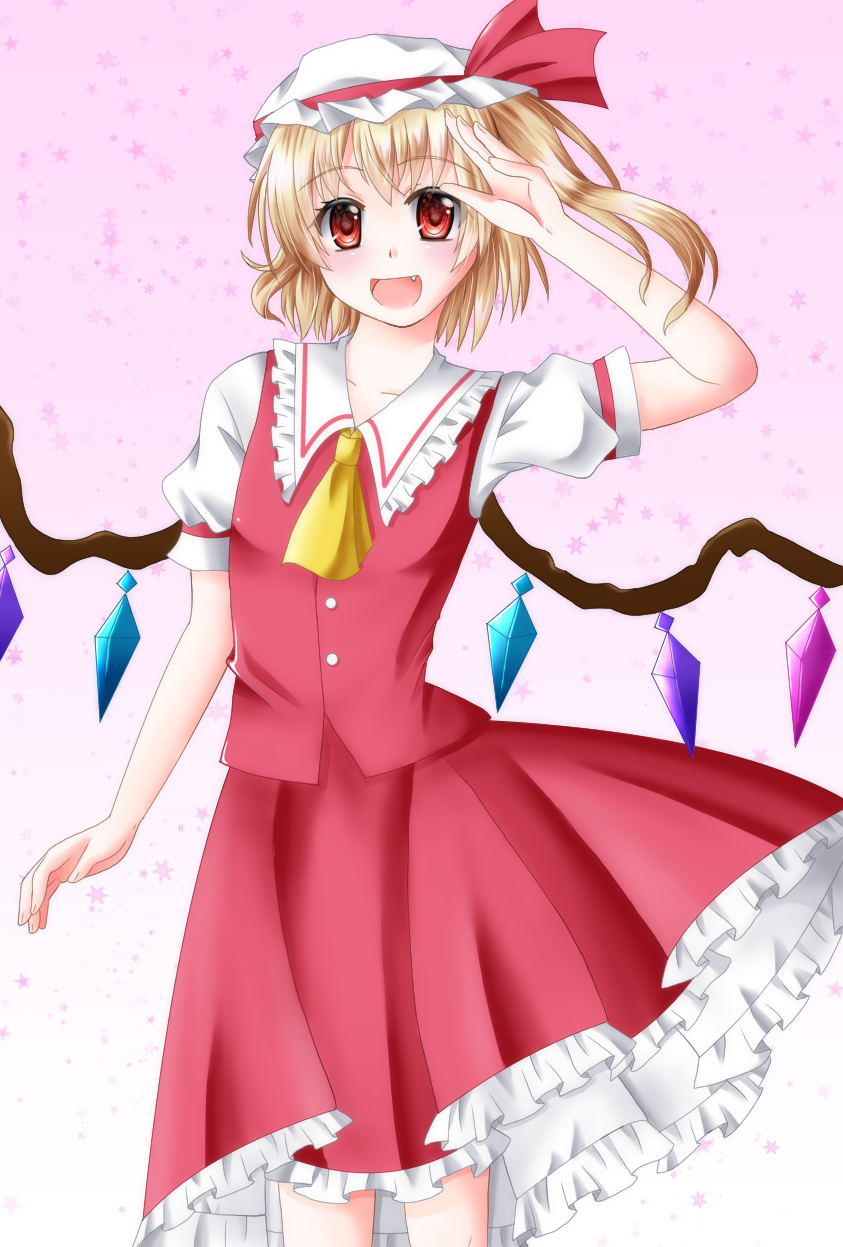1girl ascot blonde_hair commentary crystal fang flandre_scarlet hat hat_ribbon highres looking_at_viewer mob_cap multicolored_wings one_side_up open_mouth puffy_short_sleeves puffy_sleeves red_eyes red_skirt red_vest ribbon shirt short_sleeves side_ponytail skirt skirt_set smile solo touhou vest white_hat white_shirt wings yellow_ascot yue_(kitami_maki)