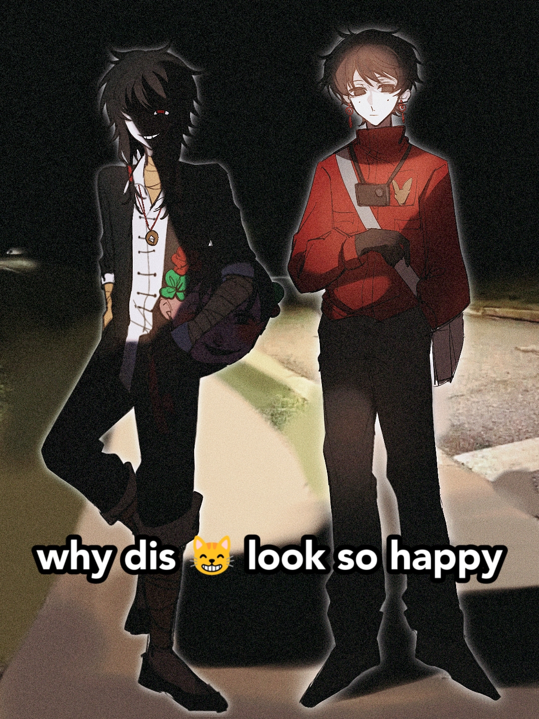 2boys alternate_eye_color black_gloves black_hair black_jacket black_pants black_shoes boots brown_boots camera camera_around_neck chinese_commentary closed_mouth coin coin_on_string collared_shirt commentary_request earrings english_text film_grain full_body gloves grey_bag grin high_collar highres holed_coin jacket jewelry li_yuting_(male) long_sleeves male_focus meme mole mole_under_each_eye mole_under_eye multiple_boys multiple_moles open_clothes open_collar open_jacket pants red_eyes shirt shoes short_hair sleeves_rolled_up smile standing touqi_guaitan white_shirt why_dis_ninja_look_so_mad_(meme) xieyuni ziche_fuzhao