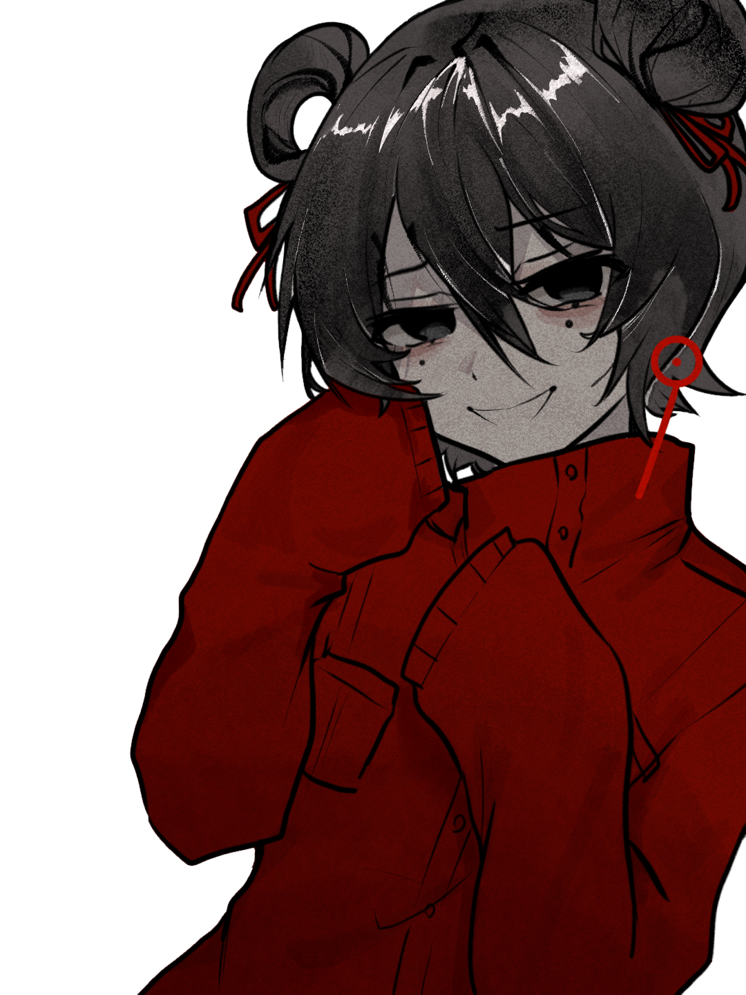 1girl black_eyes black_hair chinese_commentary colored_skin commentary_request earrings film_grain grin hair_between_eyes hair_bun hair_ribbon hair_rings high_collar highres jacket jewelry li_yuting_(female) long_sleeves mole mole_under_each_eye mole_under_eye multiple_moles red_jacket red_ribbon ribbon short_hair simple_background single_hair_bun single_hair_ring sleeves_past_fingers sleeves_past_wrists smile solo touqi_guaitan upper_body variant_set white_background white_skin yiqiongpiyisichen