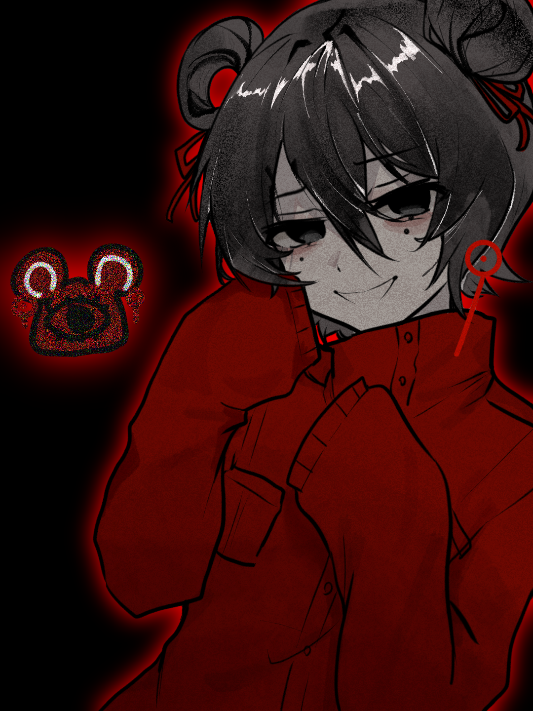 1girl black_background black_eyes black_hair chinese_commentary colored_skin commentary_request earrings film_grain grin hair_between_eyes hair_bun hair_ribbon hair_rings high_collar highres jacket jewelry li_yuting_(female) li_yuting_(mouse) long_sleeves mole mole_under_each_eye mole_under_eye multiple_moles red_jacket red_ribbon ribbon short_hair single_hair_bun single_hair_ring sleeves_past_fingers sleeves_past_wrists smile touqi_guaitan upper_body variant_set white_skin yiqiongpiyisichen