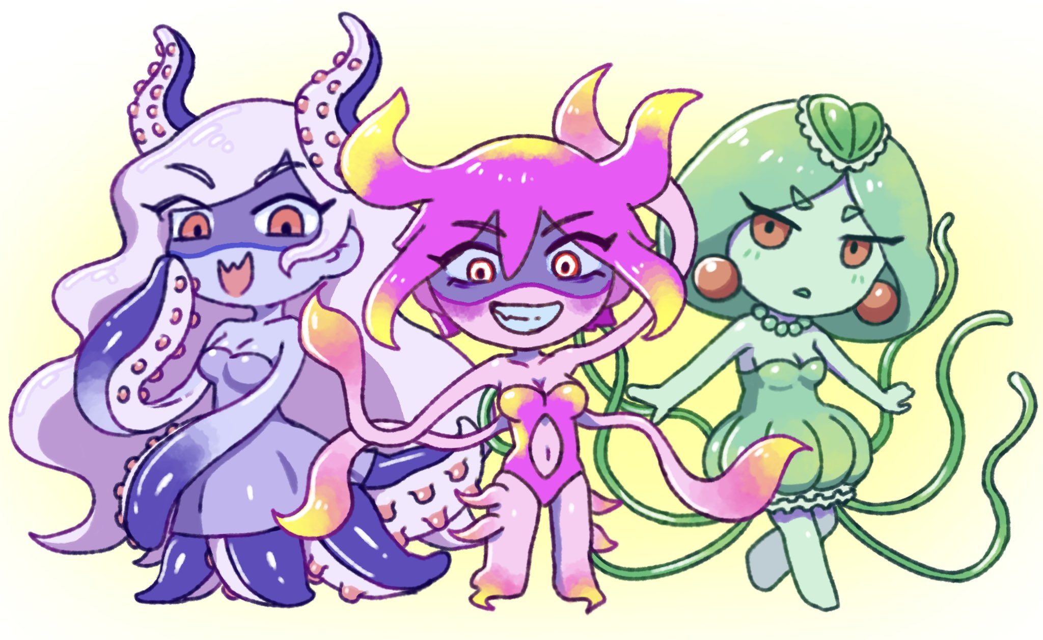 3girls bare_shoulders barefoot blonde_hair blue_skin breasts chibi chibi_only cleavage collarbone colored_skin earrings evil_grin evil_smile gradient_hair green_hair green_skin grey_hair grin highres jewelry kato_(momota_rosan) long_hair marina_(omori) medium_breasts medusa_(omori) molly_(omori) multicolored_hair multiple_girls navel necklace omori open_mouth parted_lips pink_hair pink_skin red_eyes short_hair smile teeth tentacle_hair