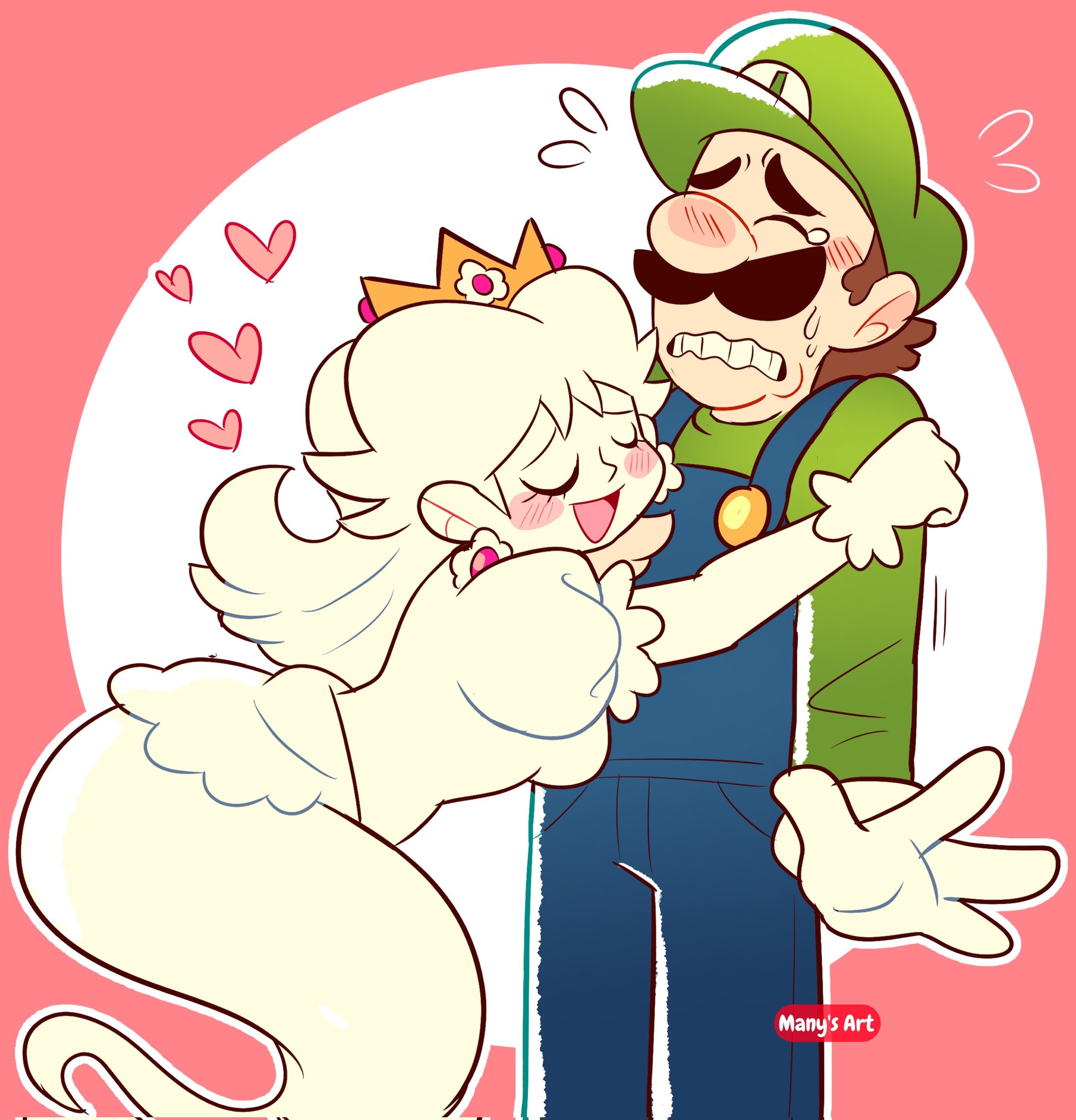 1boy 1girl 2024 :d alternate_form artist_name blue_overalls blush_stickers breasts brown_hair newsboy_cap chest_jewel closed_eyes collarbone commentary crown dress earrings emblem english_commentary facial_hair floating flower_earrings ghost ghost_girl ghost_tail gloves green_hat green_shirt hands_on_own_face hat highres hug jewelry long_hair luigi manysart1 mario_(series) medium_breasts mustache nervous nintendo open_mouth overalls pink_background pink_eyes princess_daisy scared shirt smile standing sweatdrop untranslatable_commentary tareme upper_body white_dress white_gloves white_hair