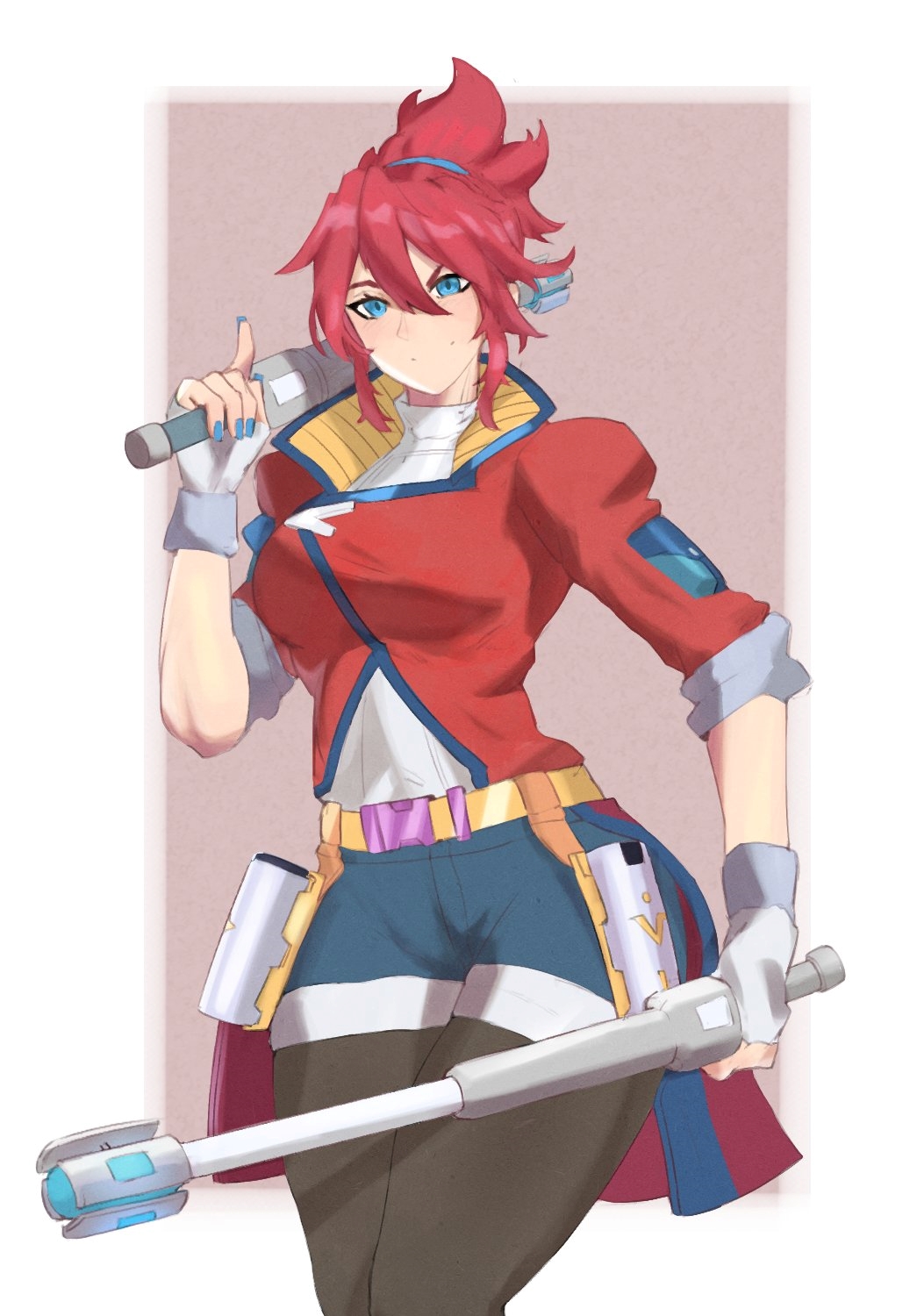 1girl blue_eyes blue_nails fingerless_gloves gloves hi-fi_rush highres holding holding_weapon jacket korsica_(hi-fi_rush) mokuppoh over_shoulder pantyhose ponytail red_hair red_jacket shorts smile solo weapon weapon_over_shoulder