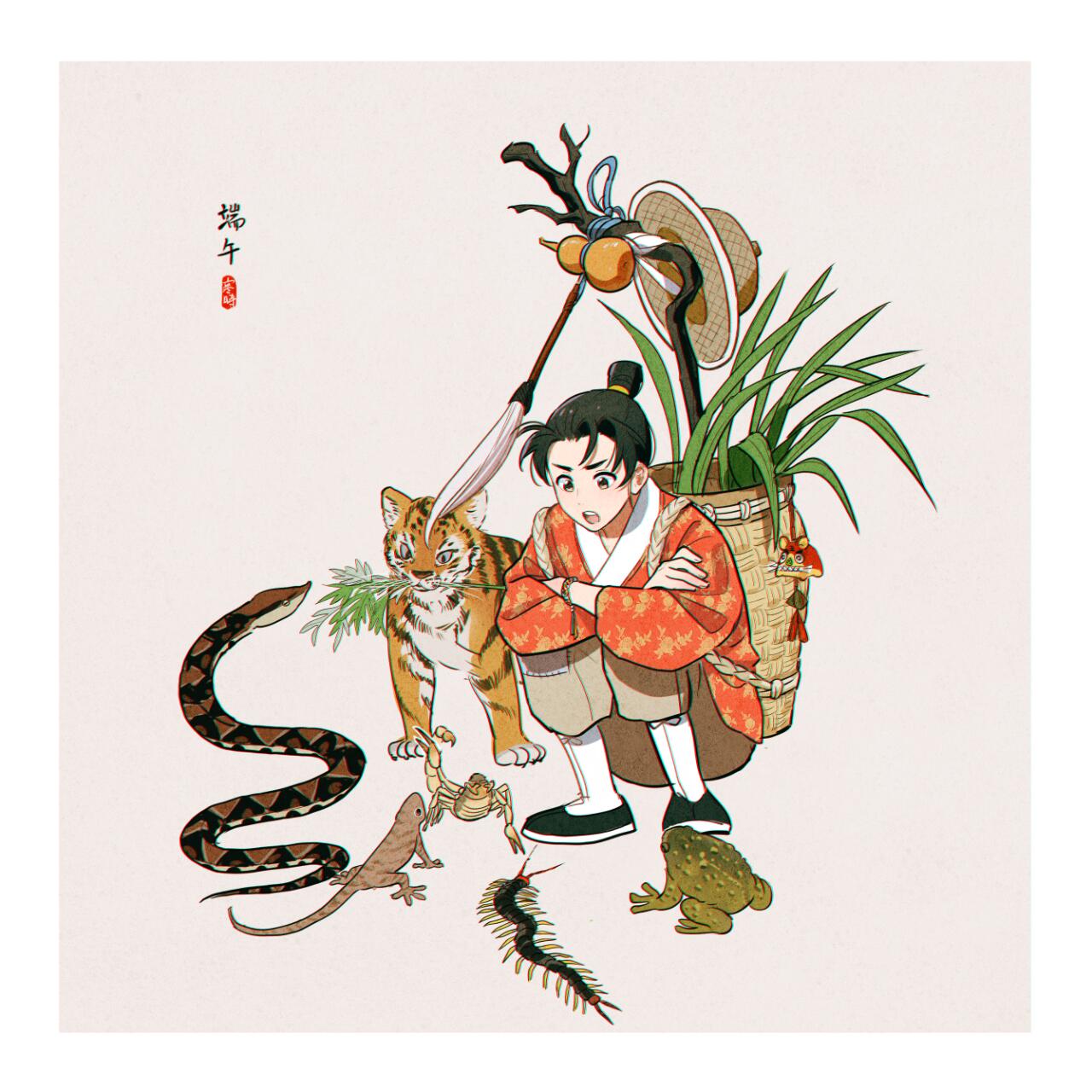 1boy 1girl animal animal_ears backpack_basket bad_link bad_xiaohongshu_link bag bamboo basket black_eyes black_hair black_shoes chinese_clothes food fruit full_body gourd hair_bun han_shi_reina hanfu hat highres jiaoling_ruqun leaf lizard long_sleeves male_focus open_mouth original pants plant scorpion shoes simple_background single_hair_bun snake socks solo squatting tiger_ears unworn_hat unworn_headwear