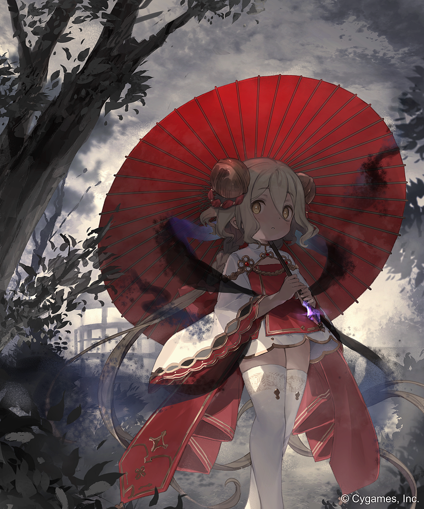 1girl braid braided_ponytail brown_hair company_name curly_hair dark dress feet_out_of_frame flat_chest fog foliage hair_between_eyes hair_ornament high_collar holding holding_umbrella ines_(shadowverse) japanese_clothes leaf long_hair long_sleeves looking_at_viewer nature official_art outdoors red_dress red_umbrella shadow shadowverse solo standing thighhighs thighs tree two-tone_dress umbrella white_dress white_thighhighs wide_sleeves yellow_eyes yuuhi_homare