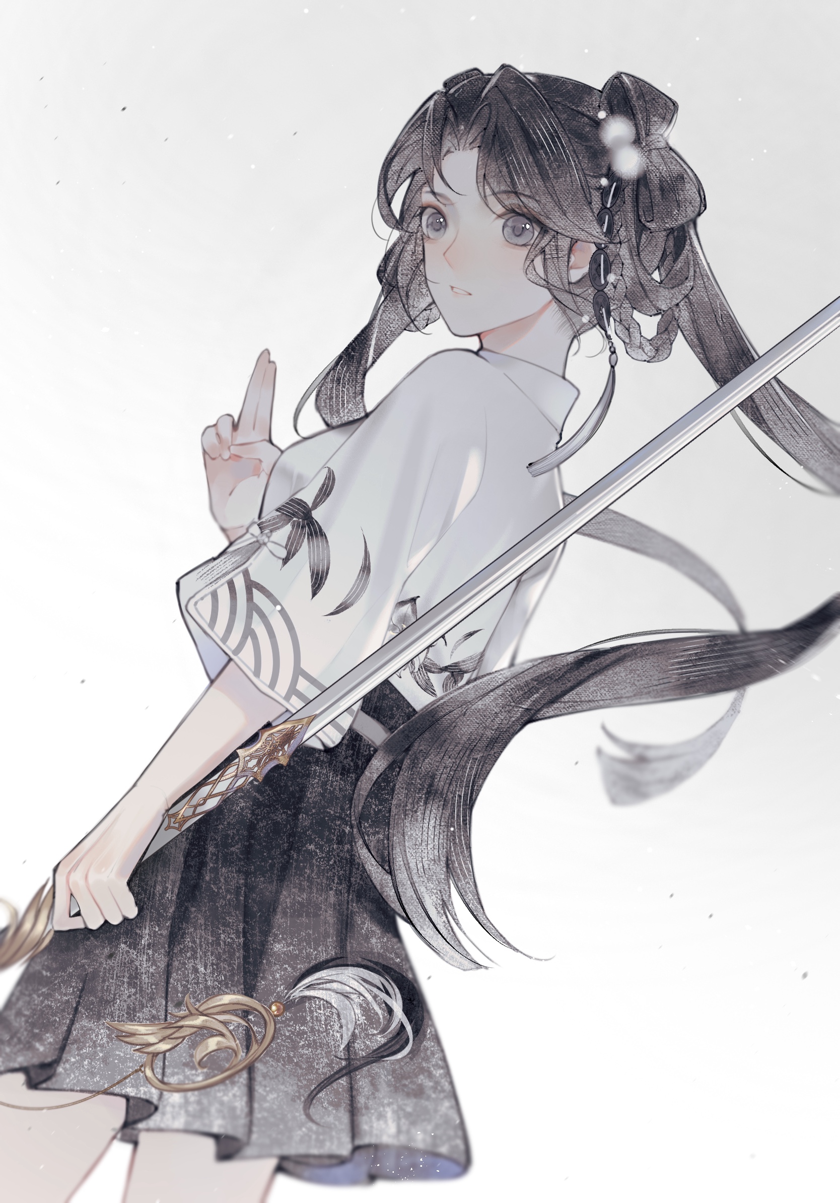 1girl bad_link bad_xiaohongshu_link black_hair black_skirt braid braided_hair_rings chinese_clothes closed_mouth cowboy_shot grey_eyes hair_ornament hair_rings hanfu highres holding holding_sword holding_weapon index_finger_raised jian_(weapon) long_hair looking_at_viewer looking_back original parted_bangs shirt shuangyaji skirt solo sword twintails very_long_hair weapon white_background white_shirt zixia_bujiangying