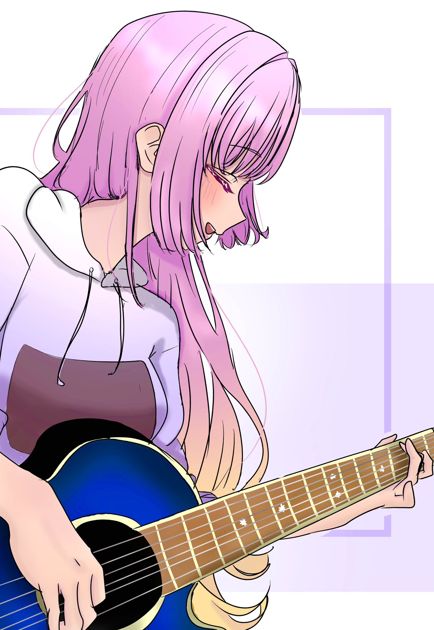 1girl acoustic_guitar anyoji_hime anyoji_hime_(winter_loungewear) blonde_hair blunt_bangs blush breasts commentary drawstring gradient_hair guitar highres hood hood_down hoodie instrument link!_like!_love_live! long_hair loungewear love_live! medium_breasts multicolored_hair official_alternate_costume open_mouth pink_hair playing_guitar playing_instrument profile purple_background purple_hoodie rere_88rere sidelocks sideways_mouth solo swept_bangs untranslatable_commentary upper_body very_long_hair virtual_youtuber
