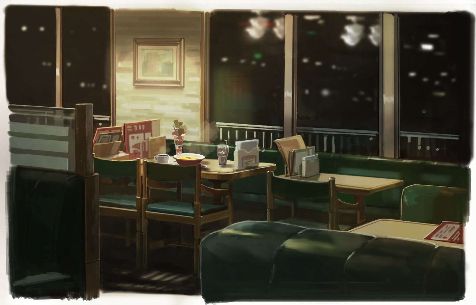 border bowl coffee_mug cup drinking_glass drinking_straw highres indoors mug no_humans original picture_frame reflection scenery table white_border window yakan_(2281101)