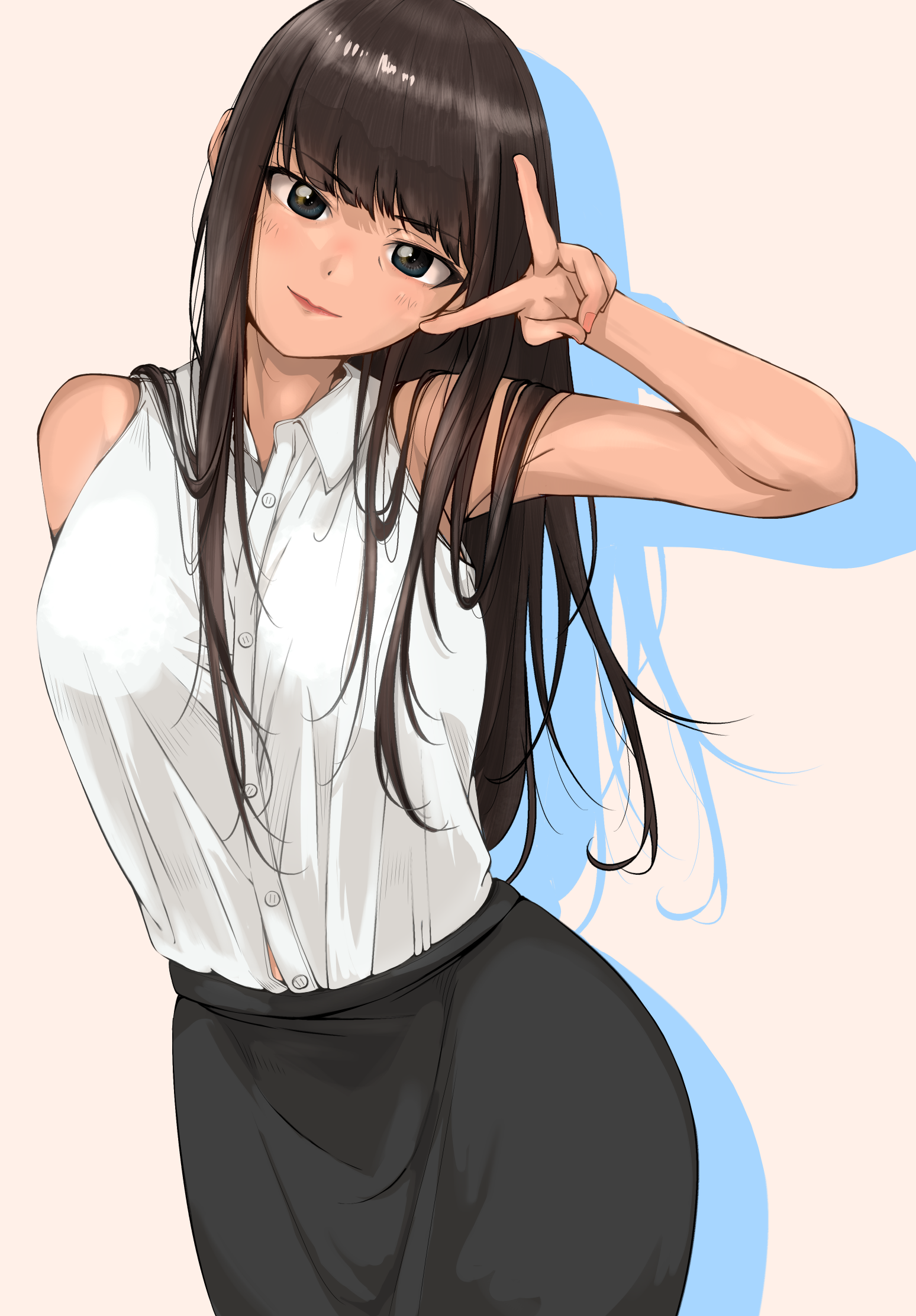 1girl black_skirt blunt_bangs breasts brown_eyes brown_hair girls_und_panzer highres long_hair mature_female nishizumi_shiho peba shirt skirt sleeveless smile solo v white_shirt