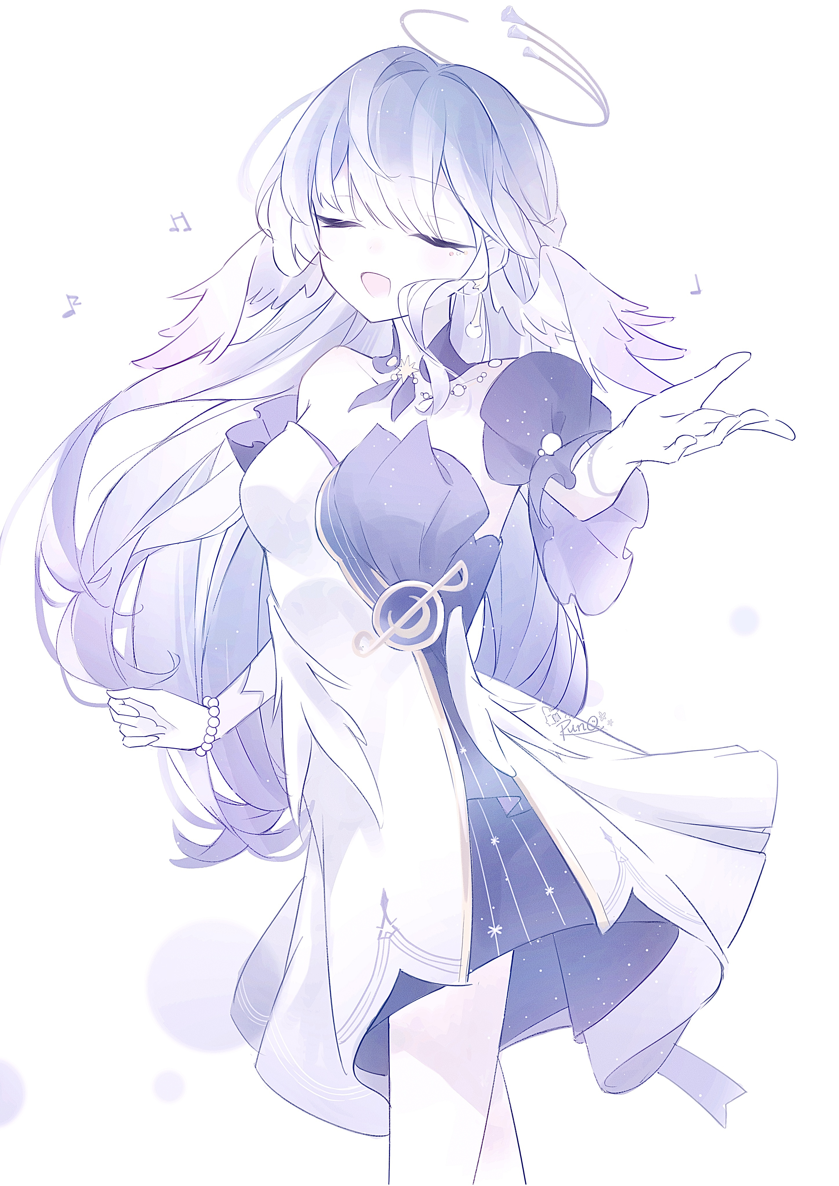 1girl absurdres bare_shoulders bracelet breasts closed_eyes collar commentary_request cowboy_shot detached_sleeves dress earrings facing_viewer gloves halo hand_up head_wings highres honkai:_star_rail honkai_(series) jewel_under_eye jewelry long_hair mechanical_halo medium_breasts music musical_note musical_note_ornament open_mouth pearl_bracelet purple_collar purple_dress purple_hair purple_sleeves r_no10126 robin_(honkai:_star_rail) signature simple_background singing solo strapless strapless_dress two-tone_dress very_long_hair white_background white_dress white_gloves white_wings wings