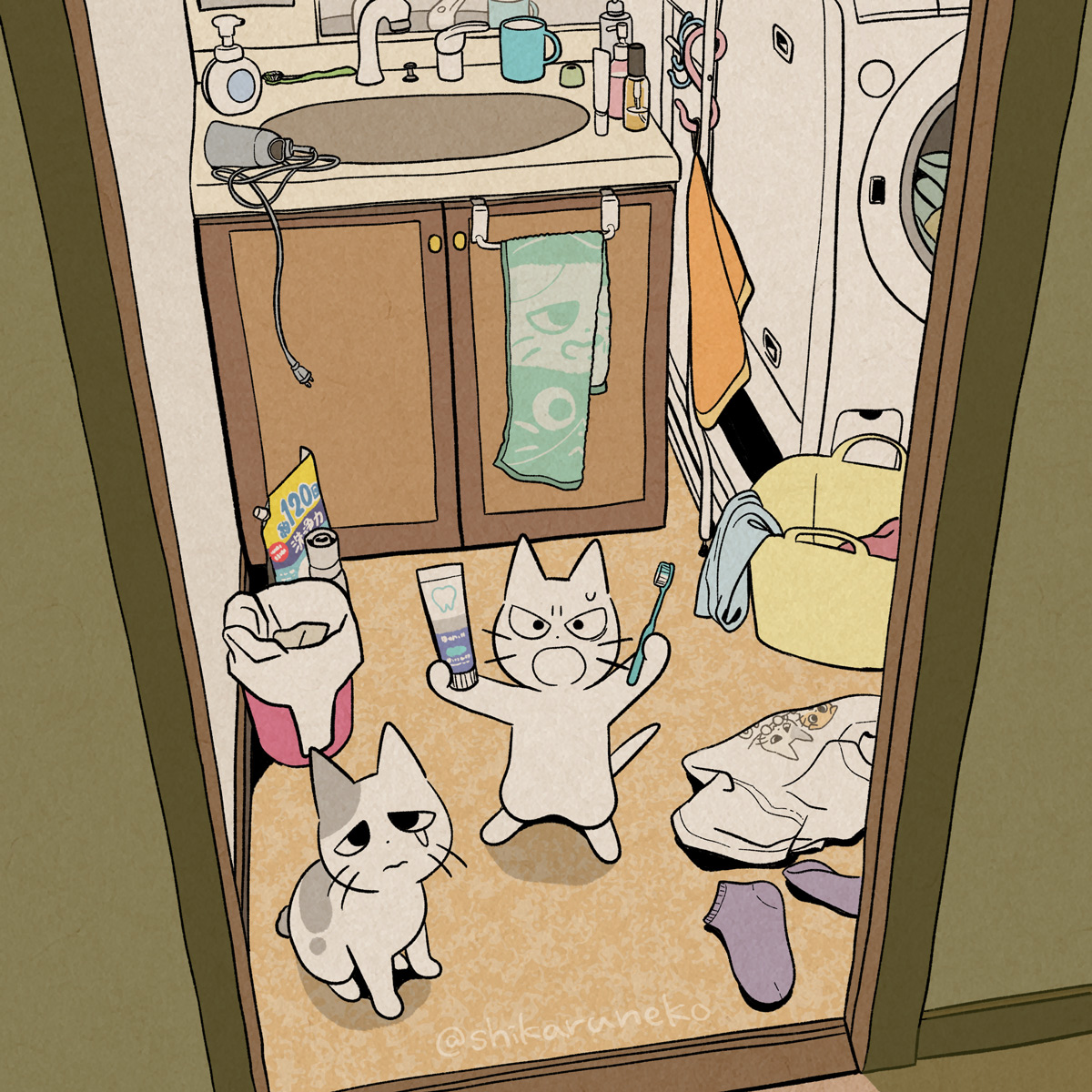 animal animal_focus bathroom cat cup doorway faucet highres holding holding_toothbrush indoors looking_at_viewer mirror mojacookie mug no_humans shikaru_neko shikaru_neko_(character) shirt sink socks standing toothbrush toothpaste towel trash_can twitter_username unworn_clothes unworn_shirt unworn_socks washing_machine watermark whiskers
