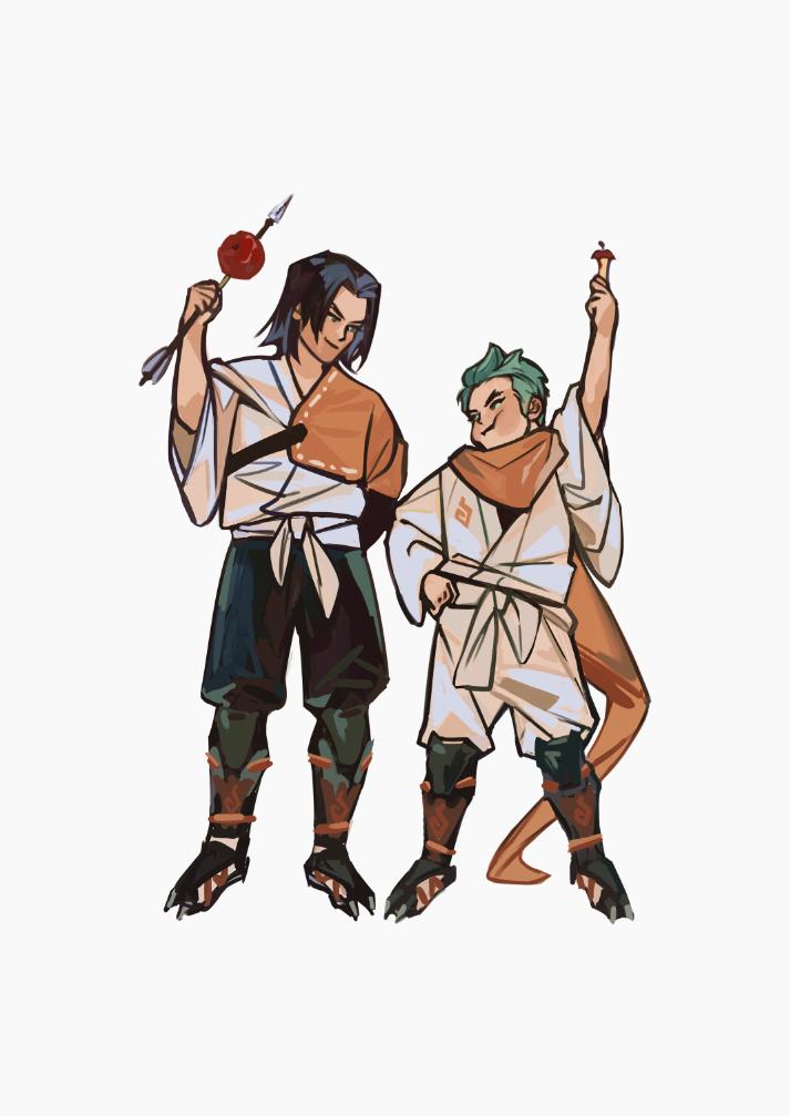 2boys aged_down apple apple_core arm_behind_back arm_up arrow_(projectile) black_footwear black_hair black_pants brothers chewing clawed_boots eye_contact food forked_eyebrows fruit genji_(overwatch) green_hair hanzo_(overwatch) holding holding_arrow holding_food holding_fruit long_scarf looking_at_another male_focus medium_hair multiple_boys orange_scarf overwatch overwatch_1 pants puppy_1ove scarf short_sleeves siblings white_pants wide_sleeves