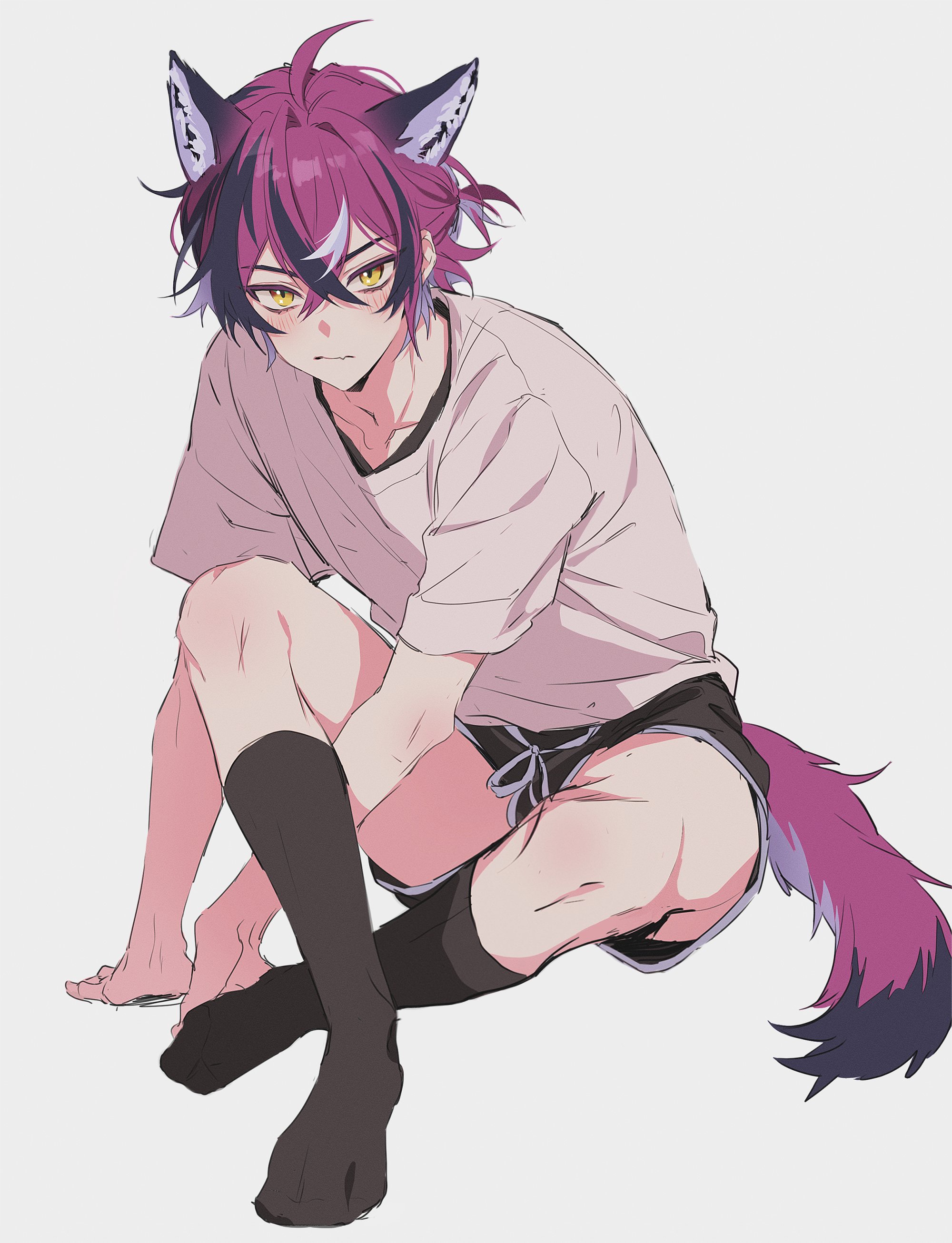 1boy absurdres animal_ear_fluff animal_ears arm_support black_shorts black_thighhighs blush closed_mouth doppio_dropscythe drawstring full_body hair_between_eyes highres kemonomimi_mode looking_at_viewer male_focus multicolored_hair nijisanji nijisanji_en owo_renren purple_hair shirt short_hair short_sleeves shorts simple_background socks solo streaked_hair tail thighhighs virtual_youtuber wavy_mouth white_background white_shirt yellow_eyes