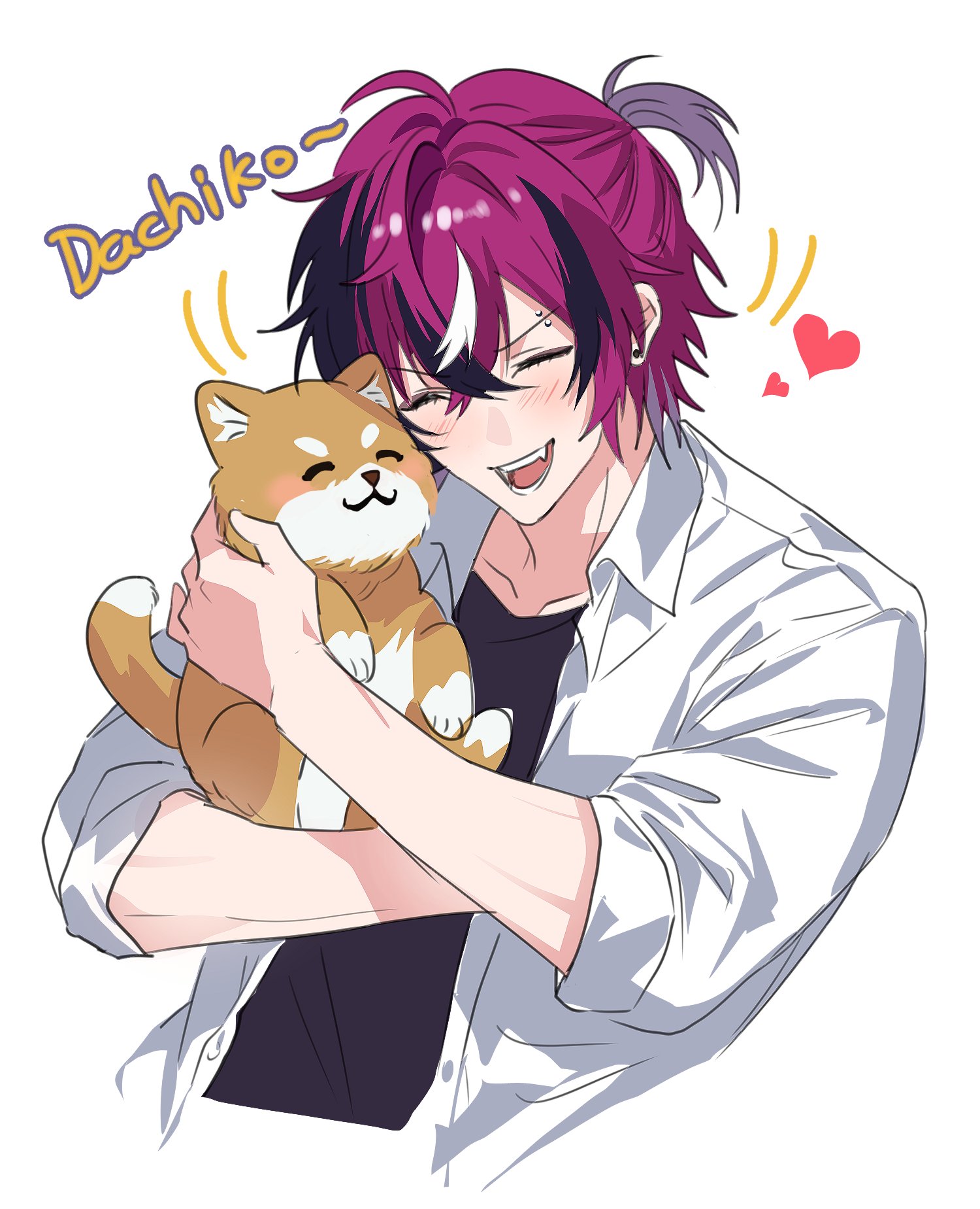 1boy ^_^ animal black_shirt closed_eyes collarbone collared_shirt crew_neck cropped_torso dog doppio_dropscythe hair_behind_ear hair_between_eyes heart highres holding holding_animal holding_dog hug layered_clothes male_focus multicolored_fur multicolored_hair nijisanji nijisanji_en open_mouth orzmjxxx ponytail purple_hair romaji_text shirt short_ponytail short_sleeves simple_background solo streaked_hair teeth upper_teeth_only virtual_youtuber white_background white_shirt