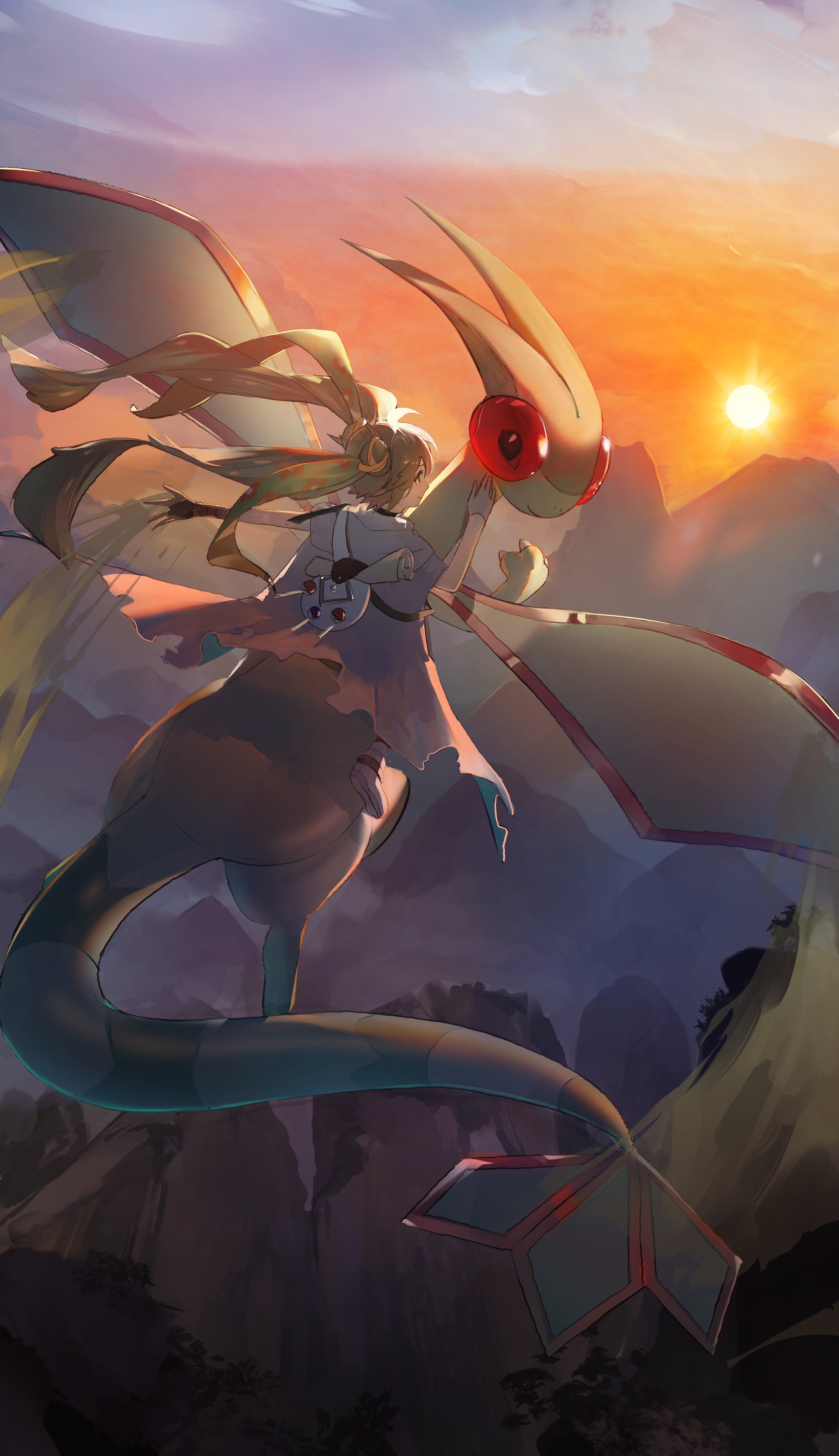 absurdres bandaged_arm bandages double_bun flygon gen_3_pokemon grey_cloak ground_miku_(project_voltage) hair_bun hatsune_miku highres kamatoyu nintendo pokemon pokemon_(creature) project_voltage vocaloid