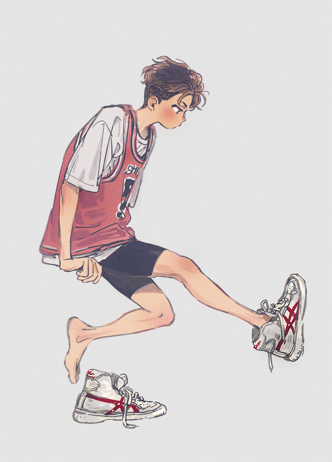 1boy aged_down bangoul basketball_jersey black_shorts blush brown_hair commentary_request crew_neck curled_fingers jitome korean_commentary layered_clothes looking_down male_focus miyagi_ryouta parted_lips profile shirt shoelaces shoes short_hair shorts simple_background slam_dunk_(series) sneakers solo unworn_shoes white_background white_shirt white_shoes