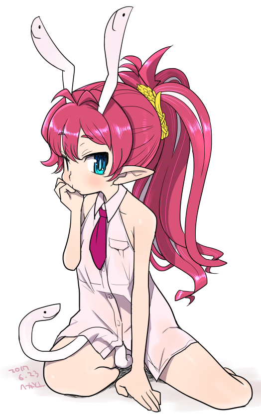 1girl animal_ears bare_shoulders blue_eyes blush flat_chest hekaton long_hair looking_at_viewer multicolored_hair original pointy_ears rabbit_ears red_hair sitting snake solo streaked_hair two-tone_hair white_hair