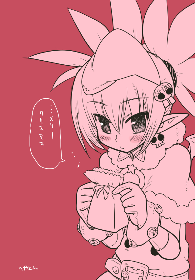 1girl blush capelet disgaea earrings etna_(disgaea) gift hat hekaton holding holding_gift jewelry monochrome pointy_ears red_theme santa_costume santa_hat skull_earrings solo