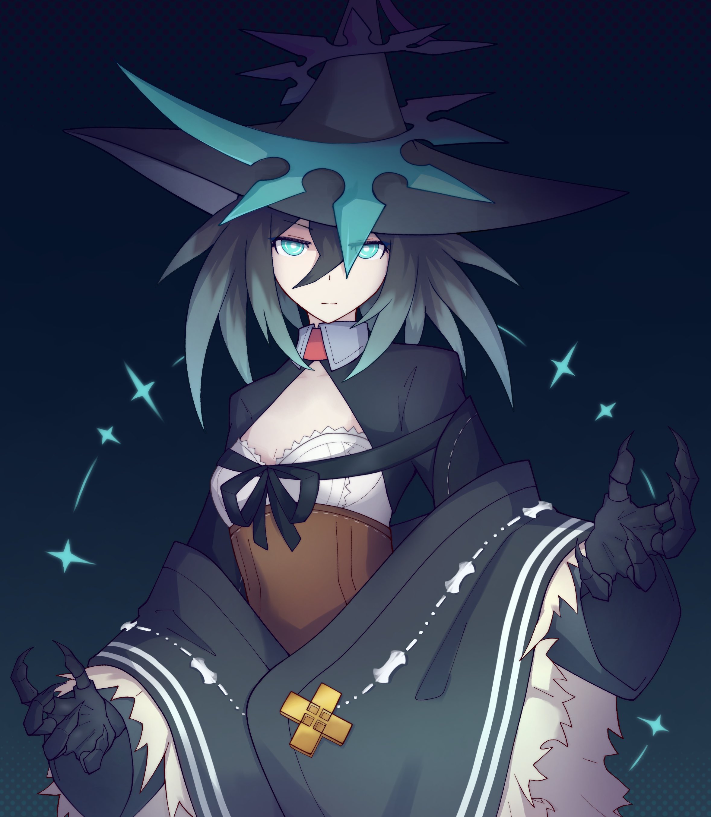 1girl absurdres black_hair black_hat black_rock_shooter black_rock_shooter_arcana blue_eyes crossed_bangs elder_caster fingernails glowing glowing_eyes gradient_hair hat highres medium_hair mehyuew39 multicolored_hair sharp_fingernails skeletal_hand solo witch_hat
