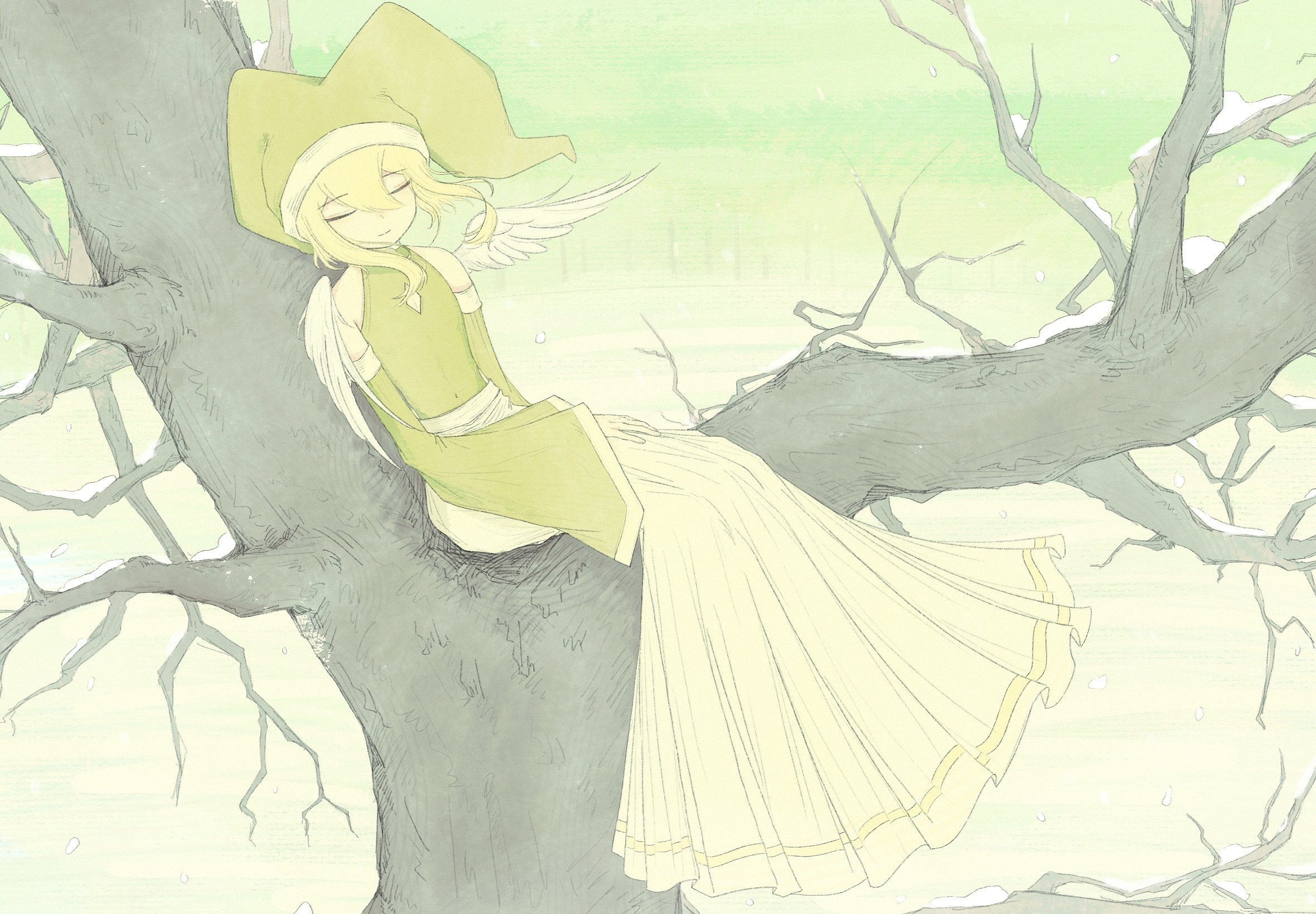 1boy ama_kaijin bare_shoulders bare_tree blonde_hair closed_eyes closed_mouth detached_sleeves diamond_cutout double-parted_bangs elona feathered_wings green_hat green_shirt green_sky green_sleeves hair_between_eyes hat highres in_tree jester_cap kumiromi_of_harvest long_skirt long_sleeves male_focus outdoors shirt short_hair single_horizontal_stripe sitting sitting_in_tree skirt sky smile snow snowing solo tree white_skirt white_trim white_wings wings