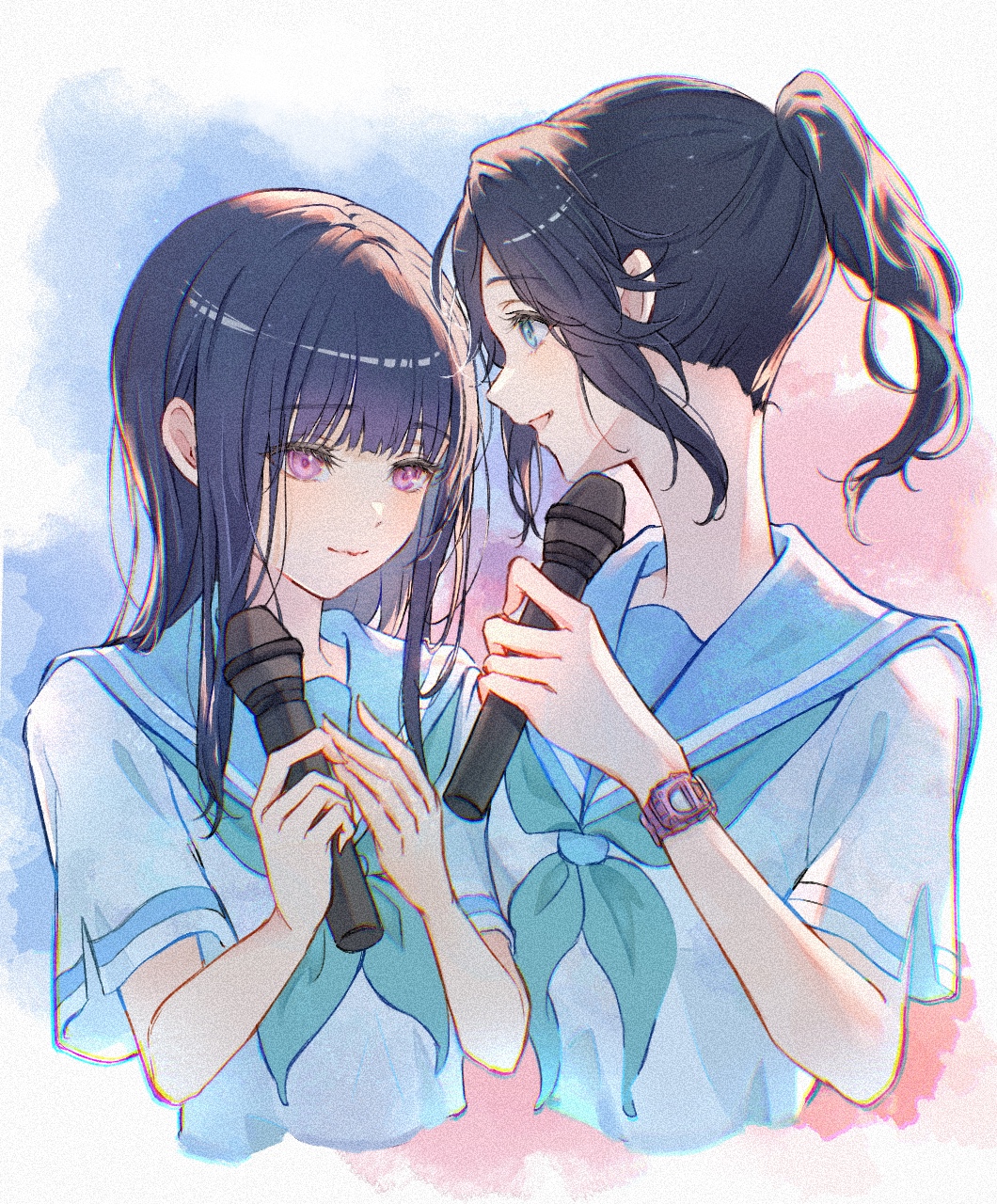 2girls anne_(violin25iori) black_hair blue_eyes blue_sailor_collar blunt_bangs blush brown_hair cropped_torso green_neckerchief hibike!_euphonium highres holding holding_microphone kasaki_nozomi kitauji_high_school_uniform light_smile liz_to_aoi_tori long_hair microphone multiple_girls neckerchief open_mouth ponytail purple_eyes sailor_collar school_uniform shirt sidelocks sleeve_slit smile upper_body watch white_shirt wristwatch yoroizuka_mizore