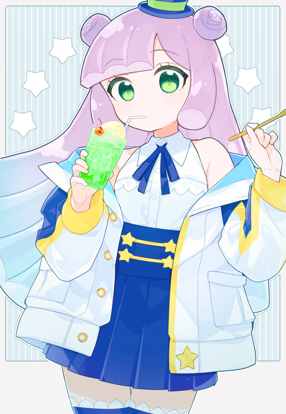 1girl bare_shoulders commentary_request drink food gradient_hair green_eyes highres ice_cream jacket koshou_shichimi long_hair looking_at_viewer monster_girl multicolored_hair open_clothes open_jacket puniru_(puniru_wa_kawaii_slime) puniru_wa_kawaii_slime skirt slightly_mature_kawaii_puniru slime_girl solo thighhighs zettai_ryouiki