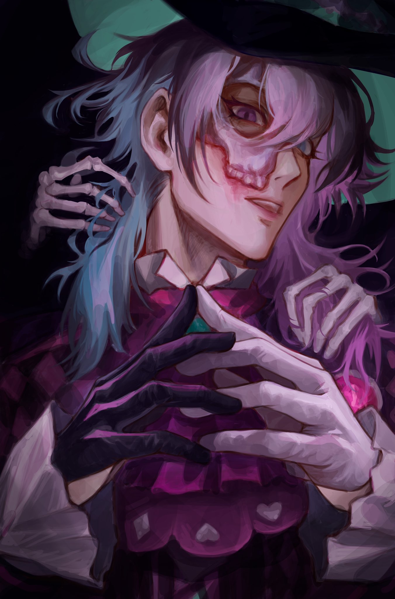 1boy ascot asymmetrical_gloves black_background black_gloves black_hat blue_eyes blue_hair commentary diamond_(shape) doppelganger_(holostars_english) frilled_sleeves frills gavis_bettel gloves hair_between_eyes half_mask hat heart heterochromia highres holostars holostars_english long_hair long_sleeves looking_at_viewer male_focus mask minnibuka mismatched_gloves multicolored_hair official_alternate_costume open_mouth painterly purple_ascot purple_eyes purple_hair simple_background skeleton skull_mask slit_pupils solo steepled_fingers untranslatable_commentary teeth top_hat upper_body virtual_youtuber white_gloves white_hair