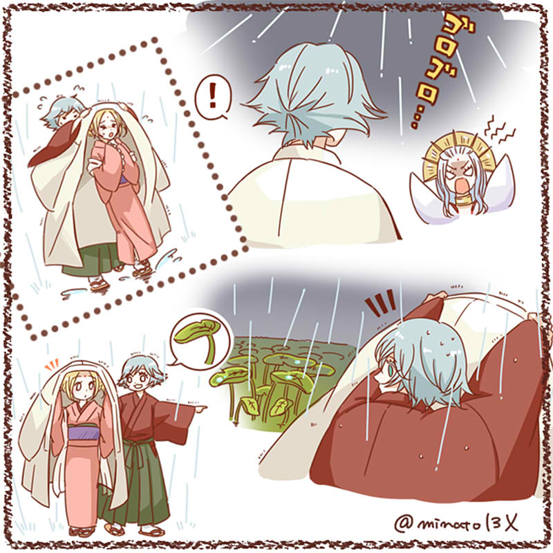 1boy 2girls blonde_hair blue_eyes blue_hair commentary_request green_hakama hakama haori improvised_umbrella japanese_clothes kamisama_hajimemashita kimono mizuki_(kamisama_hajimemashita) multiple_girls narukami_(kamisama_hajimemashita) outdoors rain red_kimono rikunaminato short_hair translation_request yonomori_mitsuha