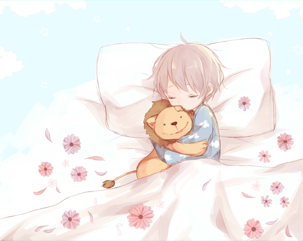 1boy ahoge blue_pajamas child closed_eyes coco_(hinatacoco) commentary_request dot_nose flower grey_hair holding holding_stuffed_toy hug long_sleeves lying male_focus on_bed on_side original pajamas petals pillow pink_flower short_hair sleeping solo stuffed_animal stuffed_lion stuffed_toy under_covers upper_body