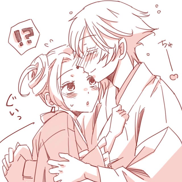 1boy 1girl blush commentary_request flying_sweatdrops hetero hug japanese_clothes kamisama_hajimemashita kimono looking_at_another mizuki_(kamisama_hajimemashita) monochrome pink_theme rikunaminato short_hair simple_background translation_request upper_body white_background yonomori_mitsuha