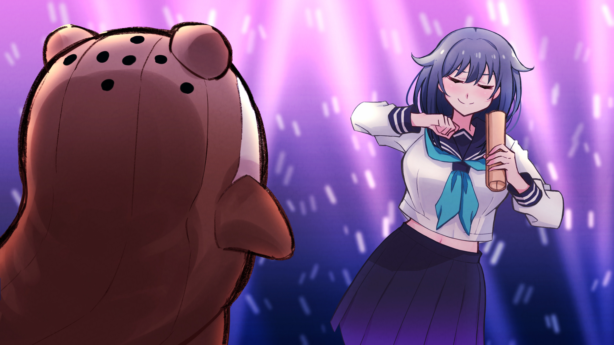 1girl alternate_costume aqua_neckerchief black_hair black_skirt bokukawauso breasts closed_eyes dancing hair_flaps highres kantai_collection kuroten large_breasts long_sleeves mascot medium_hair medium_skirt neckerchief otter pleated_skirt school_uniform serafuku shikanoko_nokonoko_koshitantan skirt smile yamashiro_(kancolle)