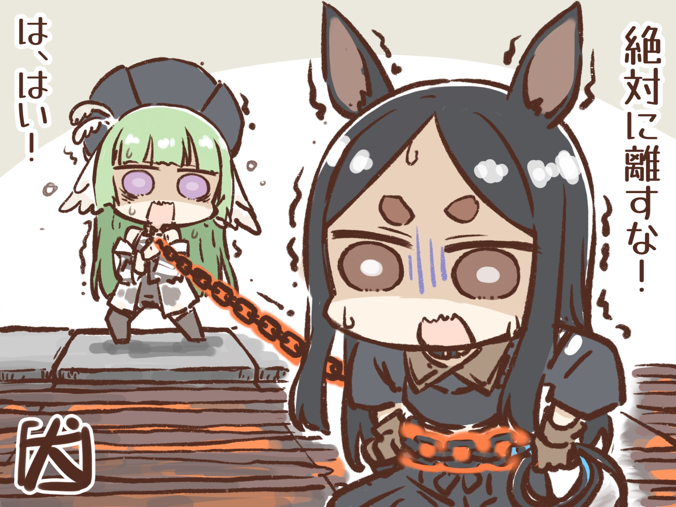 2girls akanotanin13 animal_ears arknights bare_shoulders black_hair black_hat black_thighhighs brown_eyes chain chained chibi commentary_request dobermann_(arknights) dog_ears dog_girl gameplay_mechanics green_hair hat hat_feather holding holding_chain long_hair long_sleeves multiple_girls open_mouth poncirus_(arknights) purple_eyes signature thighhighs translation_request