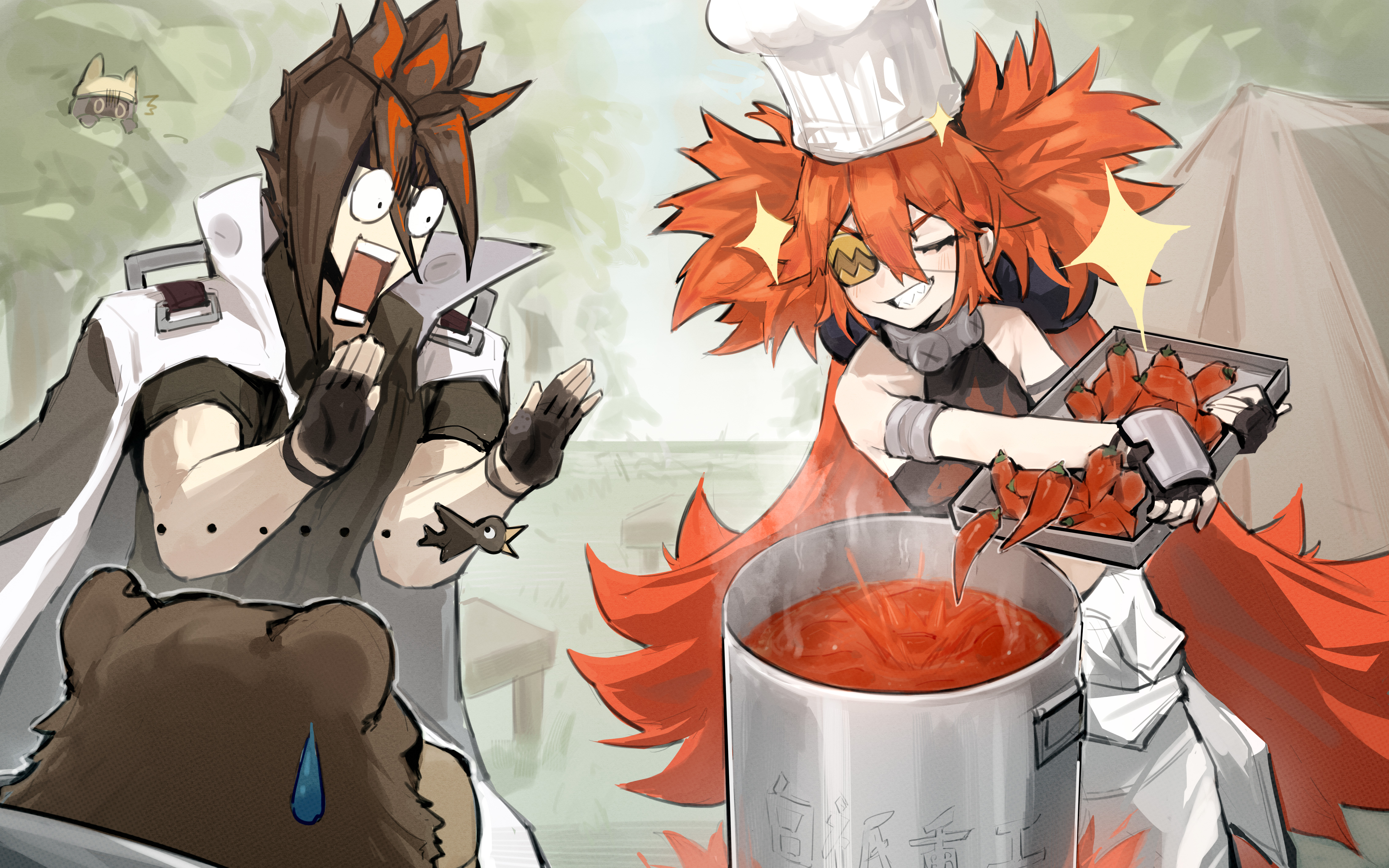 1girl 2boys absurdres anton_ivanov bangboo_(zenless_zone_zero) ben_bigger black_gloves black_hair bush chili_pepper clenched_teeth commentary_request cooking_pot crimes_against_food crop_top dodo_(yatotoyatoto) fingerless_gloves gloves grin hair_between_eyes hair_ornament highres koleda_belobog long_hair low_twintails multicolored_hair multiple_boys open_mouth outdoors red_eyes red_hair safety_(zenless_zone_zero) sharp_teeth sidelocks smile sparkle sphere_hair_ornament standing streaked_hair teeth tent twintails two-tone_hair very_long_hair zenless_zone_zero