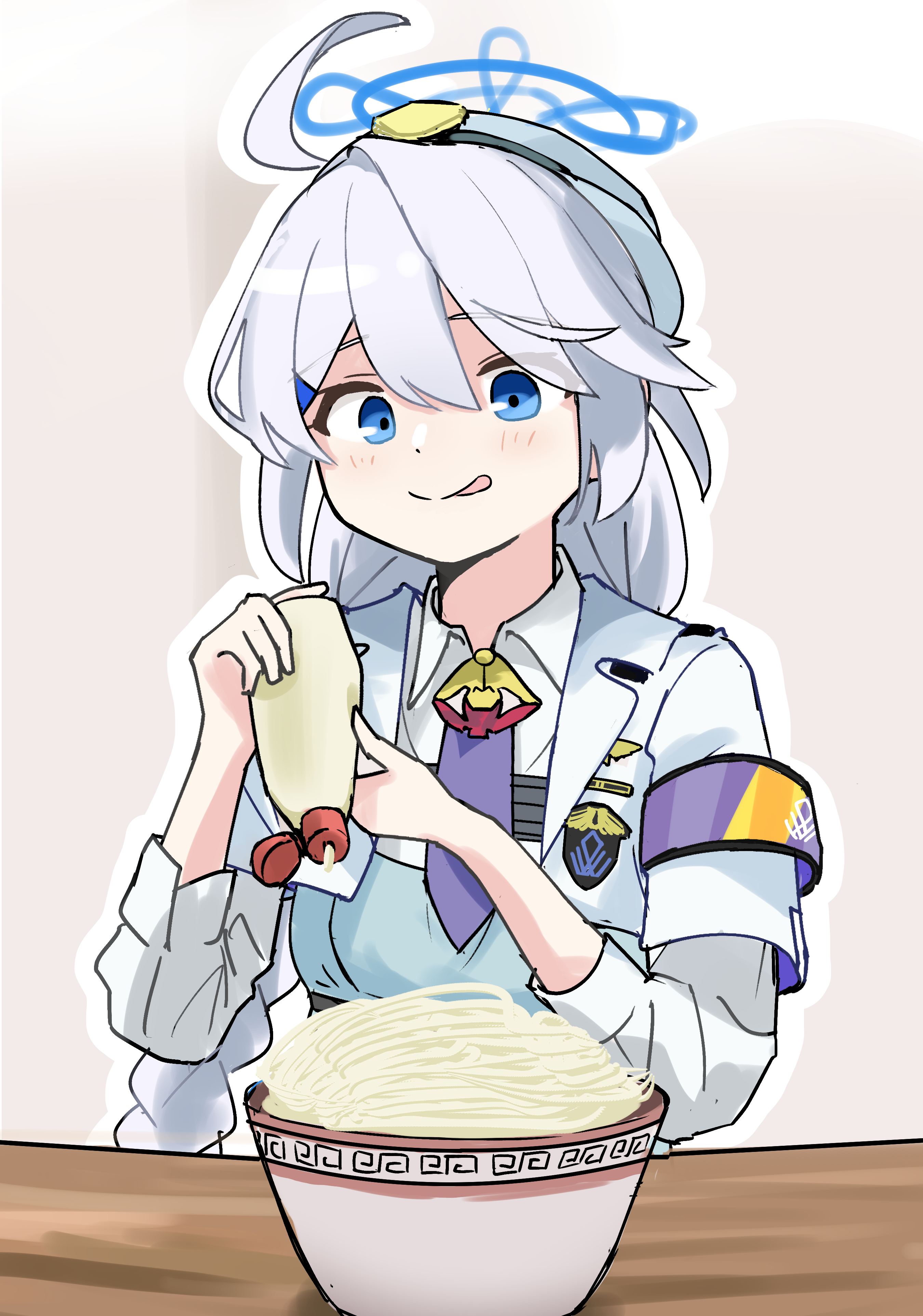 1girl absurdres ahoge armband blue_archive blue_eyes blue_halo blush bowl braid dress grey_dress gruppe hair_ornament hairclip halo hat highres jacket kirino_(blue_archive) looking_at_food mayonnaise mayonnaise_bottle necktie police police_hat police_uniform policewoman purple_armband purple_necktie shirt solo swept_bangs table tongue tongue_out twin_braids upper_body white_hair white_jacket white_shirt