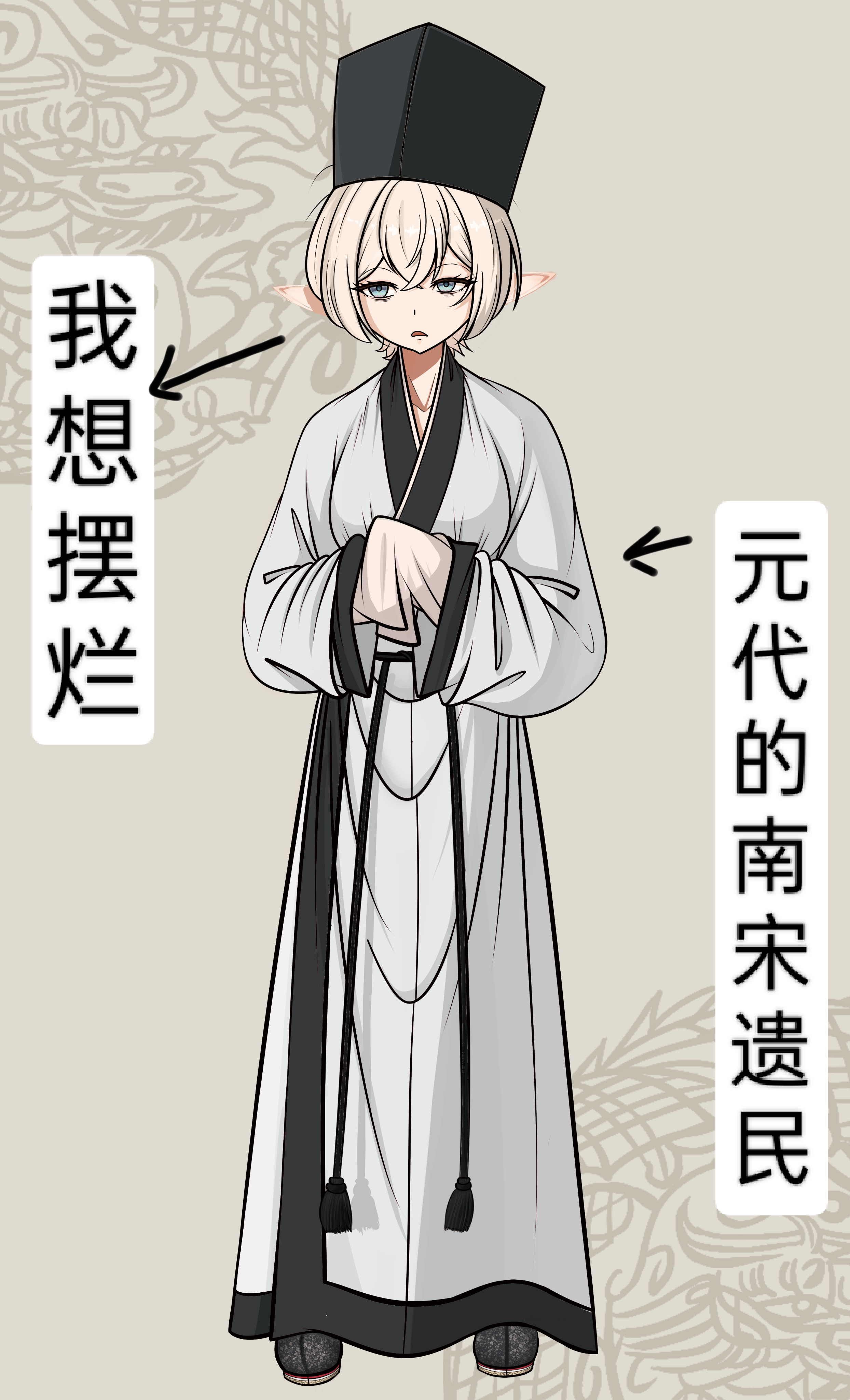 1girl absurdres bad_source blonde_hair blue_eyes chinese_clothes chinese_text dongpo_jin_(headwear) full_body grey_eyes hanfu hat highres jiaoling_ruqun jin_(headwear) long_sleeves looking_at_viewer original pointy_ears robe sange_xiaoxiangguo short_hair solo standing white_robe wide_sleeves zhijupao