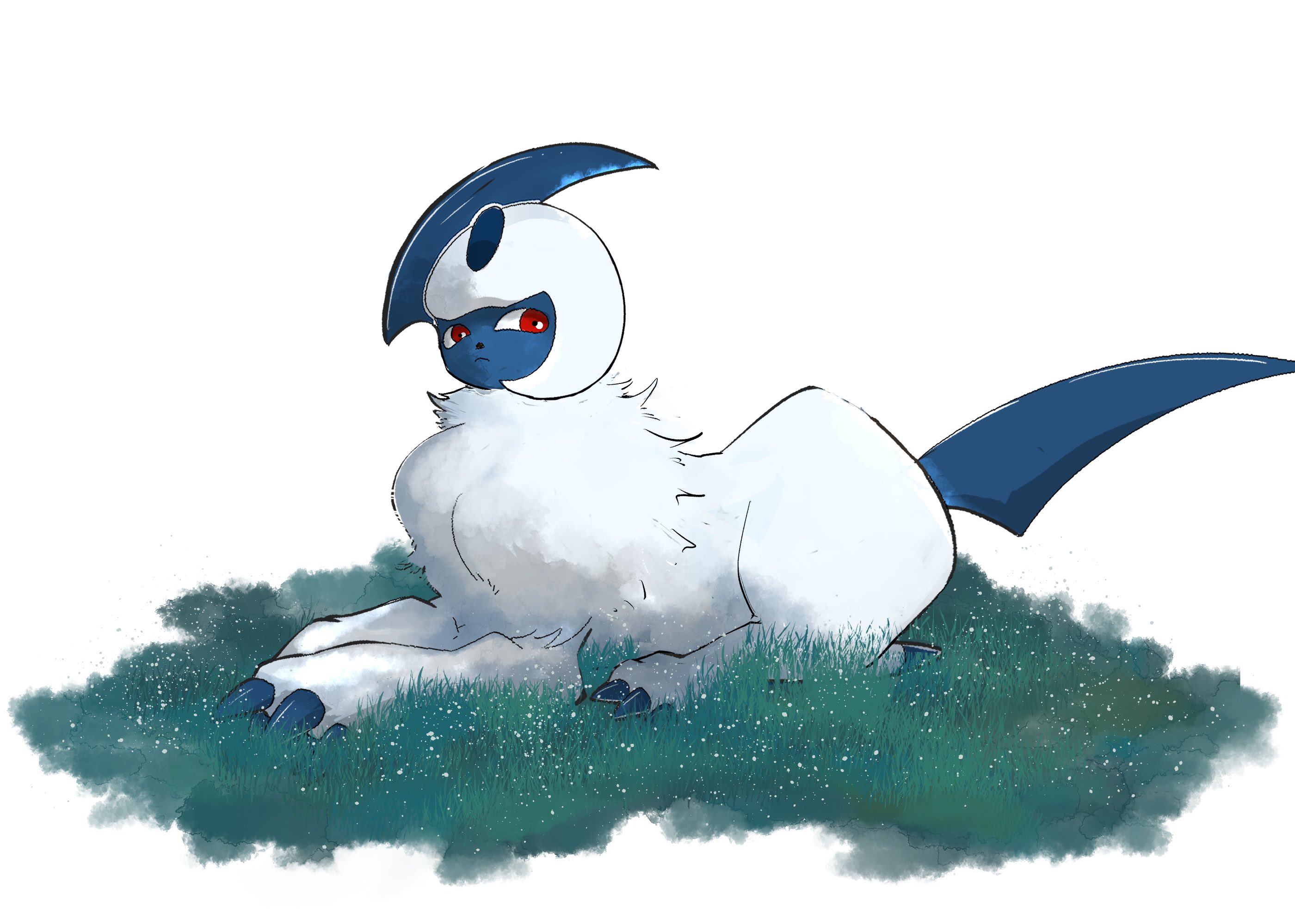 absol claws closed_mouth gen_3_pokemon grass highres horns lying nintendo no_humans pokemon pokemon_(creature) red_eyes shiratamint simple_background single_horn solo white_background white_hair