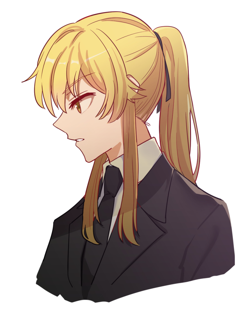 1girl blonde_hair cropped_torso formal_clothes hair_ribbon kakegurui long_hair looking_to_the_side necktie ribbon saotome_mary simple_background solo suit twintails upper_body uranium_(a3uki) white_background yellow_eyes