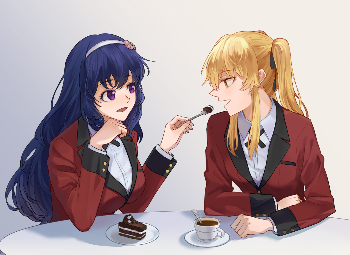 2girls blazer blonde_hair blue_hair cake cake_slice cup feeding flower food fork hair_flower hair_ornament hair_ribbon hairband hanatemari_tsuzura hyakkaou_academy_school_uniform jacket kakegurui long_hair looking_at_another multiple_girls open_mouth purple_eyes ribbon saotome_mary school_uniform simple_background sitting smile table teacup twintails uranium_(a3uki) yellow_eyes yuri