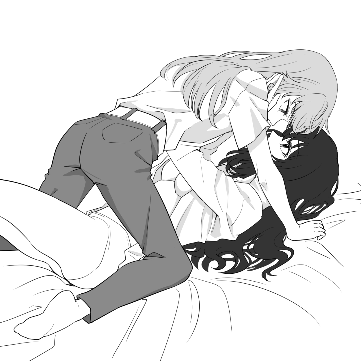 2girls bed_sheet black_hair breasts eye_contact girl_on_top hanatemari_tsuzura highres kakegurui long_hair looking_at_another medium_breasts monochrome multiple_girls no_shoes pants saotome_mary shirt simple_background socks t-shirt uranium_(a3uki) white_background yuri