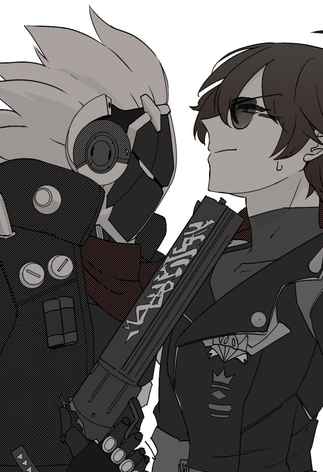 2boys billy_kid black_gloves closed_mouth commentary_request cyborg eye_contact eyes_visible_through_eyewear fingerless_gloves gloves greyscale gun hair_slicked_back high_collar holding holding_gun holding_weapon jacket lapels lighter_(zenless_zone_zero) looking_at_another male_focus mntik_kabeuti monochrome multiple_boys nervous_sweating no_pupils profile scarf shirt short_hair simple_background studded_gloves sunglasses sweat sweatdrop upper_body weapon white_background zenless_zone_zero