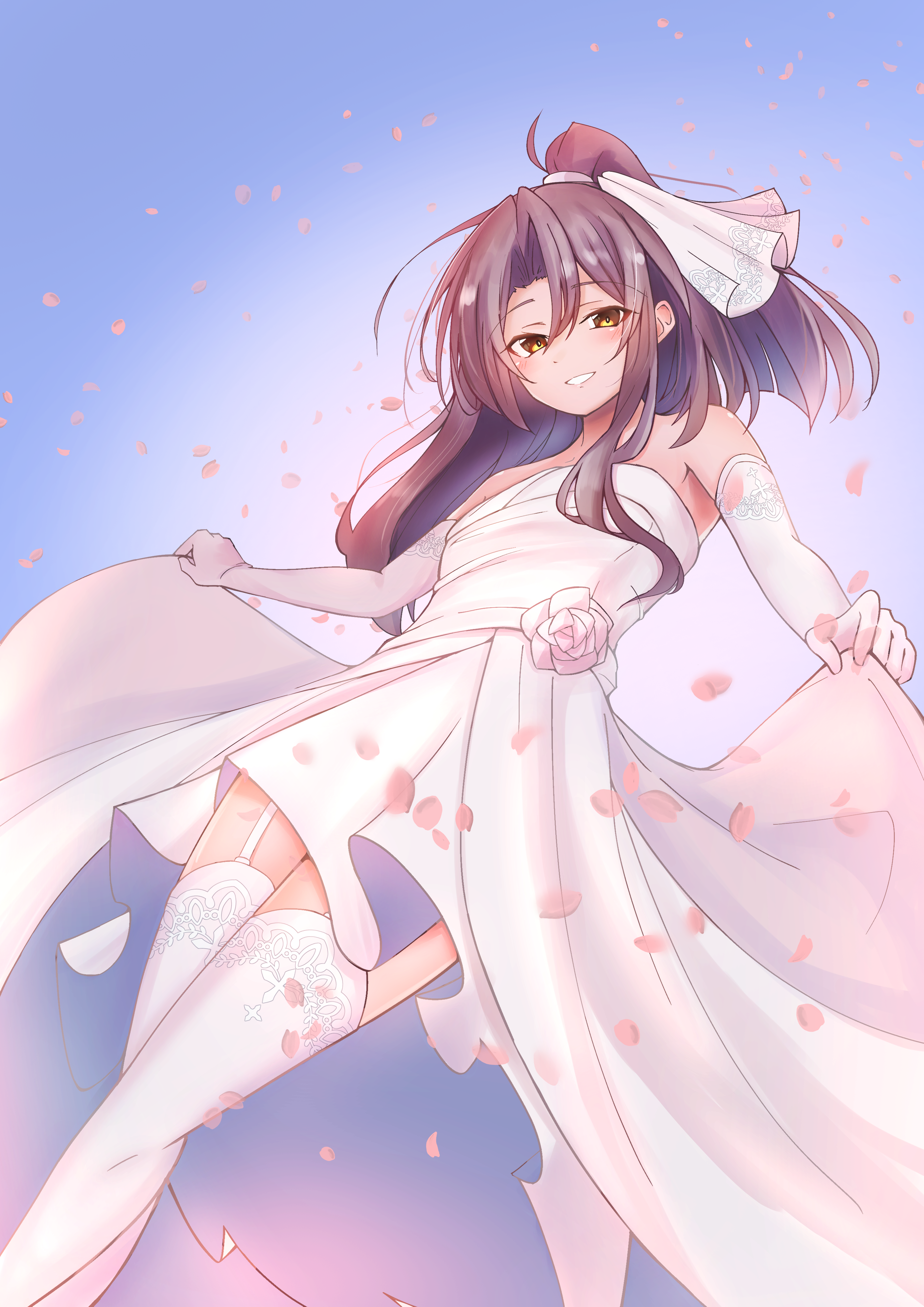 1girl 702_(naotsu) absurdres brown_eyes dress elbow_gloves feet_out_of_frame gloves grey_hair high_ponytail highres kantai_collection parted_lips ponytail smile solo strapless strapless_dress thighhighs white_dress white_gloves white_thighhighs zuihou_(kancolle)