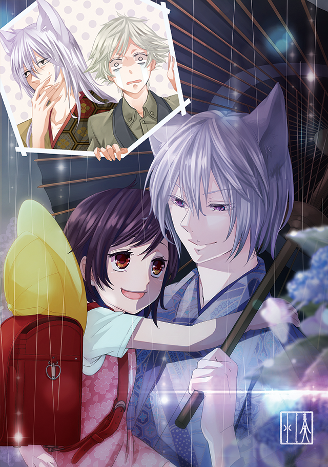 1girl 3boys aged_down animal_ears blue_kimono brown_eyes brown_hair carrying child child_carry dual_persona fox_boy fox_ears green_hair grey_hair holding holding_umbrella japanese_clothes kamisama_hajimemashita kimono long_hair looking_at_another mizuki_(kamisama_hajimemashita) momozono_nanami multiple_boys oil-paper_umbrella rain rikunaminato short_hair smile tomoe_(kamisama_hajimemashita) umbrella upper_body