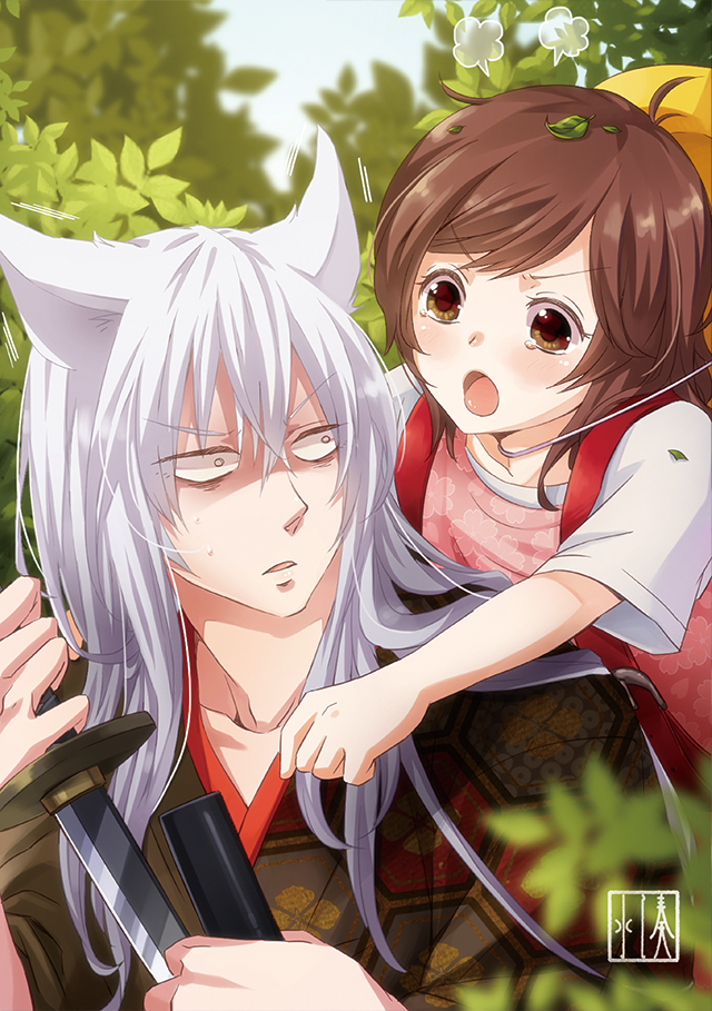 1boy 1girl aged_down animal_ears backpack bag brown_eyes brown_hair child commentary_request constricted_pupils fox_boy fox_ears holding holding_sword holding_weapon japanese_clothes kamisama_hajimemashita katana kimono long_hair looking_at_another momozono_nanami outdoors rikunaminato sword tearing_up tomoe_(kamisama_hajimemashita) unsheathed weapon white_hair