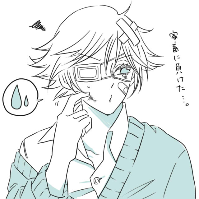 1boy bandaid bandaid_on_face blue_theme cardigan commentary_request eyepatch kamisama_hajimemashita male_focus medical_eyepatch mizuki_(kamisama_hajimemashita) monochrome rikunaminato scratching_cheek shirt short_hair simple_background solo translation_request upper_body white_background