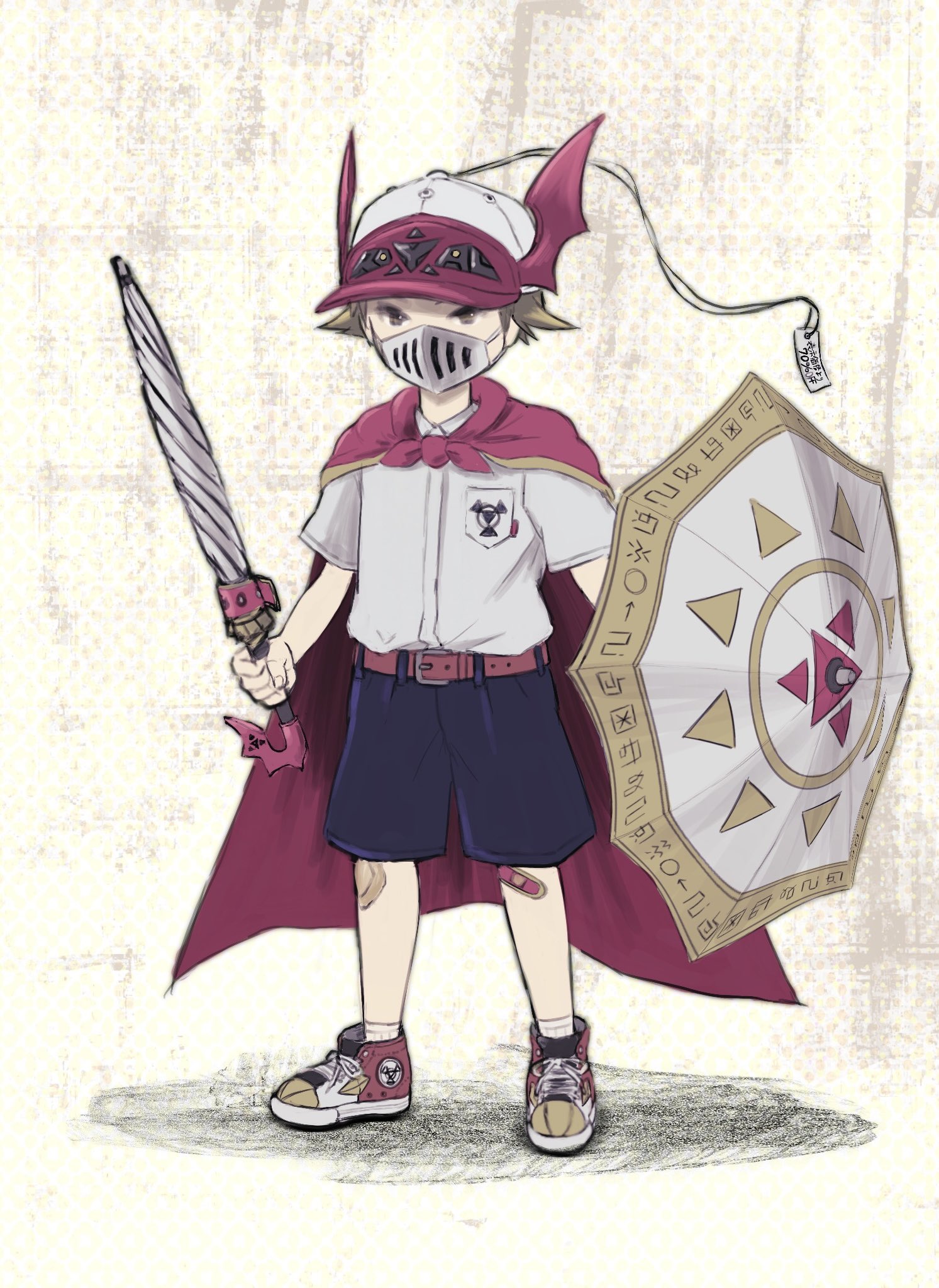 1boy baseball_cap black_shorts brown_hair cosplay digimon dual_wielding dukemon dukemon_(cosplay) full_body hat highres holding holding_umbrella male_focus mas_square mask mouth_mask shirt short_hair shorts solo umbrella white_hat white_shirt