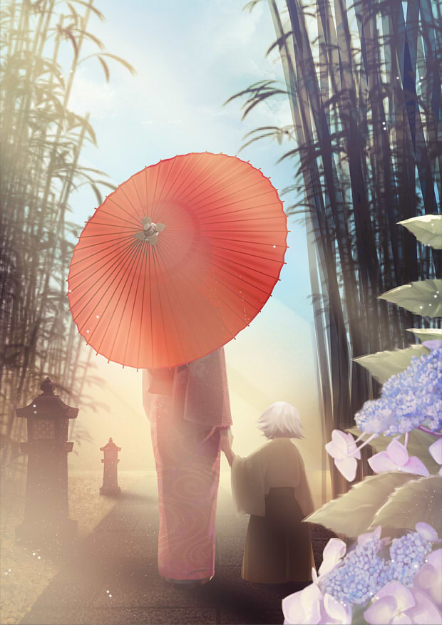 1boy 1girl bamboo bamboo_forest child flower forest full_body hakama holding holding_hands holding_umbrella hydrangea japanese_clothes kamisama_hajimemashita kimono light_rays mizuki_(kamisama_hajimemashita) nature oil-paper_umbrella outdoors pink_kimono rikunaminato short_hair umbrella white_hair yonomori_mitsuha