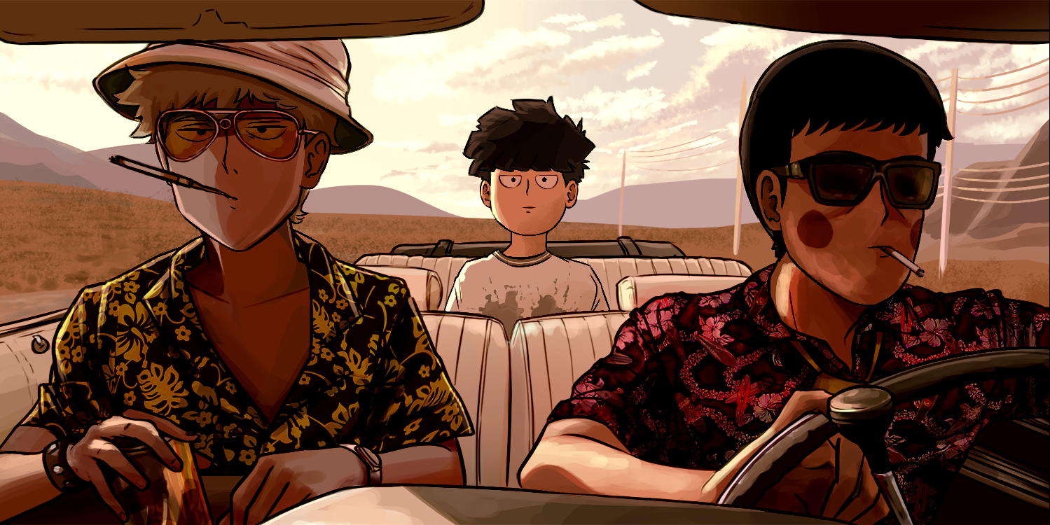 3boys black_hair blonde_hair bucket_hat can car cigarette cloud cloudy_sky convertible driving ekubo_(mob_psycho_100) fear_and_loathing_in_las_vegas grass hat hawaiian_shirt homunculus100 kageyama_shigeo mob_psycho_100 motor_vehicle multiple_boys outdoors parody power_lines reigen_arataka shirt sitting sky smoking steering_wheel sunglasses t-shirt watch wristband wristwatch
