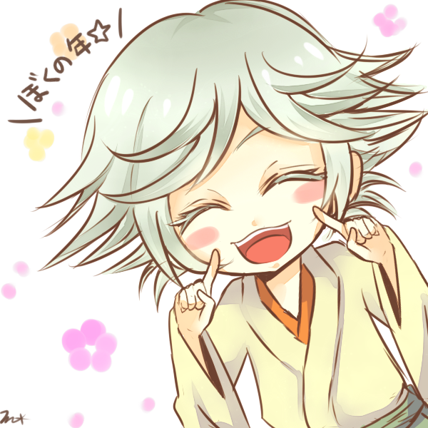1boy closed_eyes colored_eyelashes commentary_request fingersmile floral_background green_hair index_fingers_raised japanese_clothes kamisama_hajimemashita kimono male_focus mito_(mito_sand) mizuki_(kamisama_hajimemashita) short_hair solo translation_request upper_body